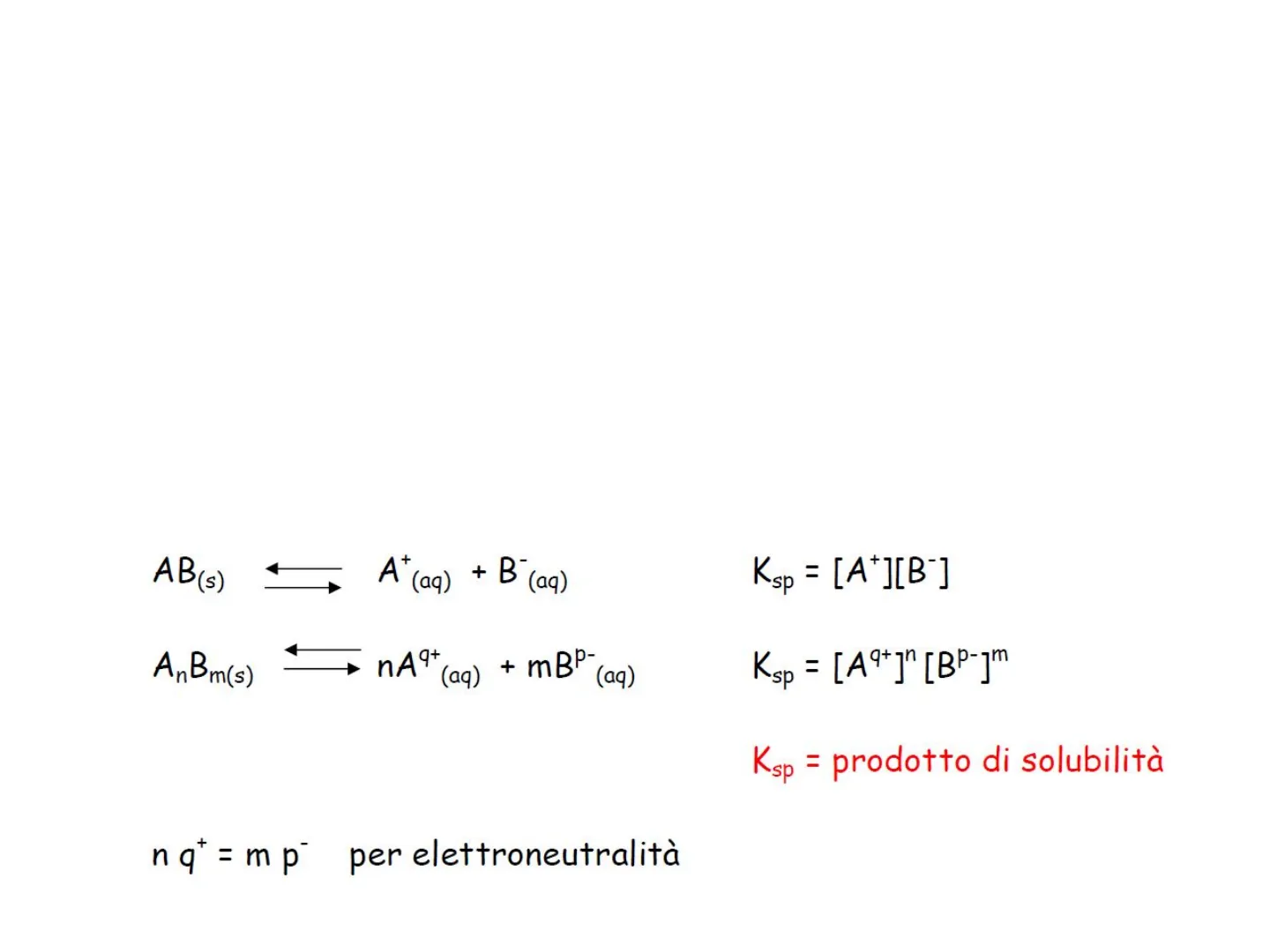 La solubilità dipende sia da Ksp sia dalla stechiometria della reazione di solubilizzazione, In generale, per: AnBm(s) nA9+(aq) + mBP (aq) Ksp = [A9+] [BP-] = (ns)" (ms)m = n"mms"+m 71/(n+m) S(AnBm)= [ (Ksp/n"m" ]
