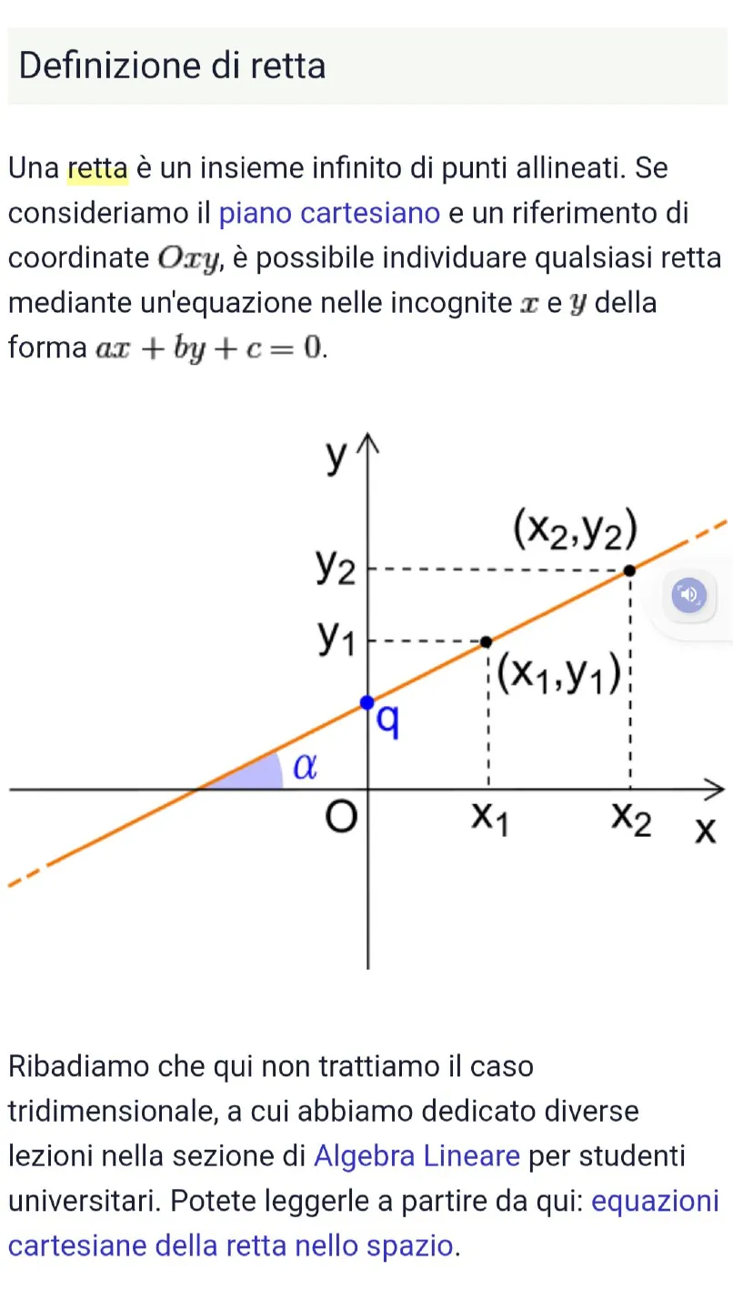 Una retta è un insieme infinito di punti allineati. Se consideriamo il piano cartesiano e un riferimento di coordinate Ory, è possibile individuare qualsiasi retta mediante un'equazione nelle incognite x e y della forma ax + by + c = 0. y ^ (x2,Y2) y2 y1 (×1,Y1) q a 1 O X1 X2 X