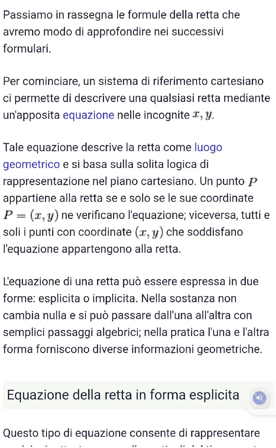 L'equazione di una retta può essere espressa in due forme: esplicita o implicita. Nella sostanza non cambia nulla e si può passare dall'una all'altra con semplici passaggi algebrici; nella pratica l'una e l'altra forma forniscono diverse informazioni geometriche.