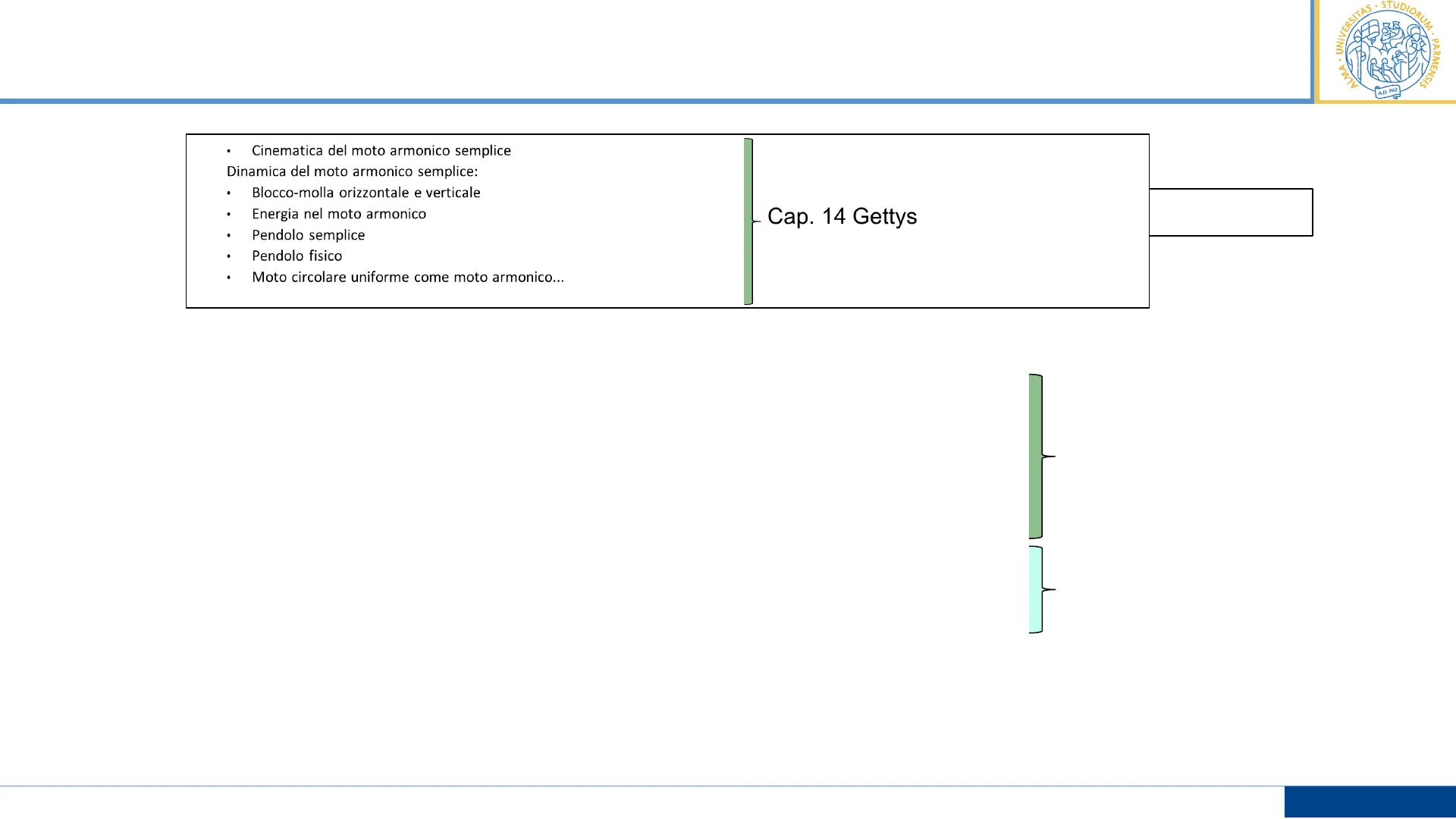 STUDIORU UNIVERSI UM . A · PARMENSIS ALMA · A.D. 962 . Fy = - ky - bvy = may k b ay = -= y -Vy Esplicitando le grandezze fisiche in funzione della posizione y (tramite derivate): d2y dt2 dt2 + b dy m dt + + =y = 0 k m Possibile soluzione di questa equazione differenziale (senza entrare nei dettagli della risoluzione) è: y = e-Yt A cos(wst ++) Y = b/2m ως = m k -(b/2m)2 Pulsazione diversa da quella dell'oscillatore libero (w = \k/m ) > ridotta da attrito viscoso (se b=0 si riduce a moto armonico semplice) Soluzione valida per smorzamenti piccoli -- > (b/2m)2 < k/m y = 0 Paletta Liquido P. Mazzolini Fisica I - LT Chimica 8