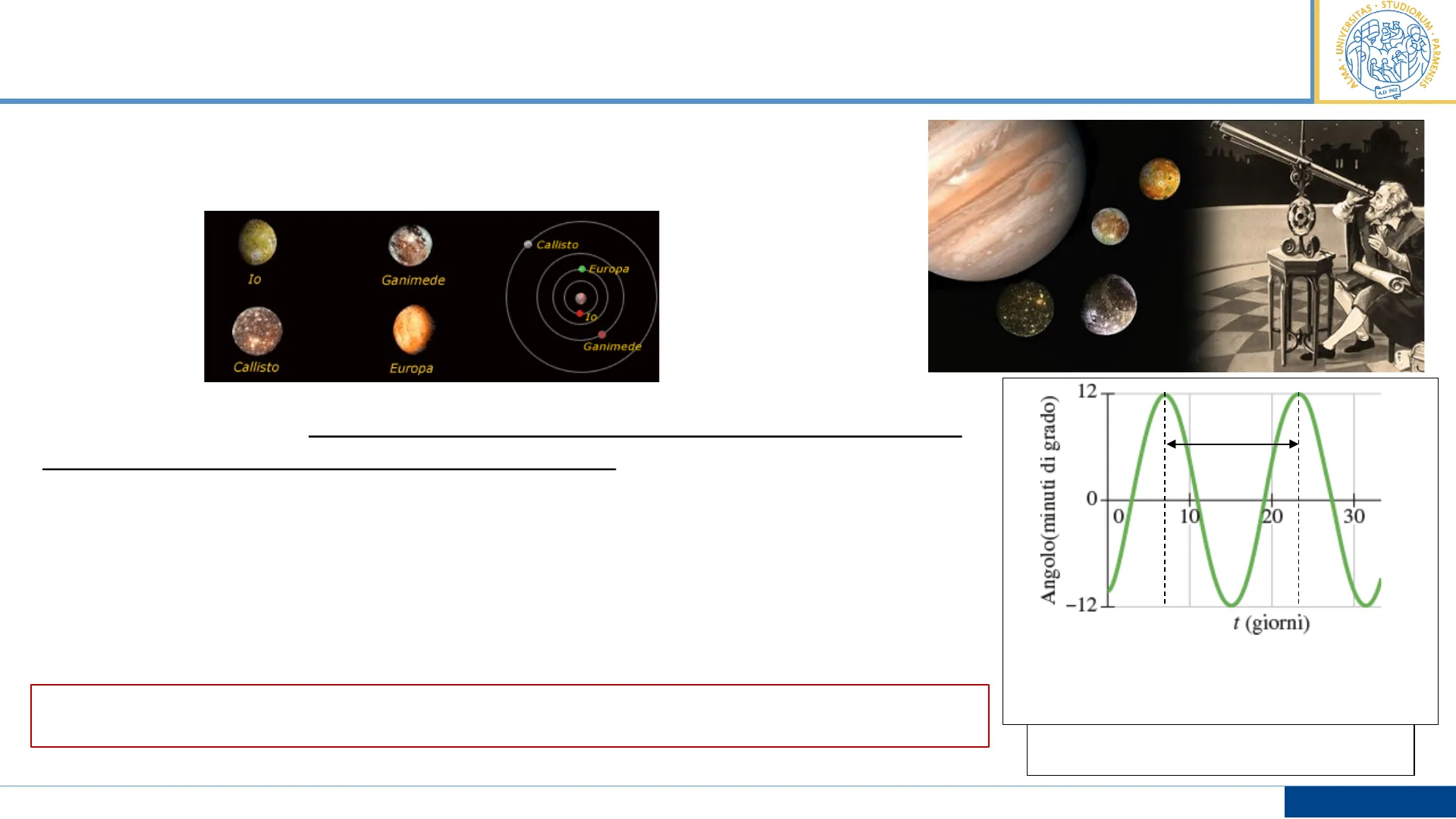 STUDIORU UNIVERSI UM ALMA . A · PARMENSIS A.D. 962 1610 Galileo Galilei scopre i 4 satelliti maggiori di Giove (satelliti Medicei o Galileiani) > lo, Europa, Ganimede e Callisto Callisto Europa Io Ganimede Ganimede Callisto Europa 12 Angolo(minuti di grado) T = 16.8 giorni 0 0 10 20 30 -12 t (giorni) Elaborazione da dati originali di Galileo della posizione di Callisto rispetto a Giove "Fondamenti di Fisica" - Halliday - Resnick, Casa editrice Ambrosiana P. Mazzolini Fisica I - LT Chimica 2 Durante le osservazioni ogni luna sembrava muoversi avanti e indietro rispetto alla posizione del pianeta secondo un moto sinusoidale (che ora identifichiamo come moto armonico semplice)> perchè? Callisto si muove su una traiettoria = circolare ad una velocità di modulo = costante >Quello che vediamo con un telescopio è la proiezione = 1d del moto circolare uniforme di Callisto attorno a Giove Il moto della proiezione di una massa che si muove di moto circolare uniforme è di tipo armonico semplice