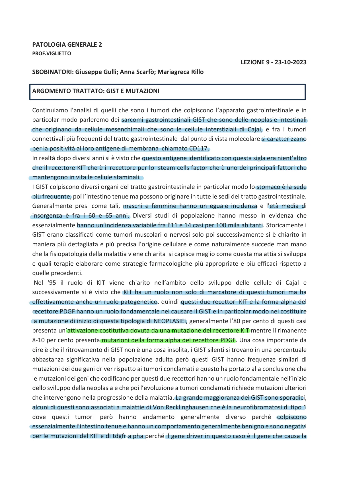 Nel '95 il ruolo di KIT viene chiarito nell'ambito dello sviluppo delle cellule di Cajal e successivamente si è visto che KIT ha un ruolo non solo di marcatore di questi tumori ma ha effettivamente anche un ruolo patogenetico, quindi questi due recettori KIT e la forma alpha del recettore PDGF hanno un ruolo fondamentale nel causare il GIST e in particolar modo nel costituire la mutazione di inizio di questa tipologia di NEOPLASIEi, generalmente l'80 per cento di questi casi presenta un'attivazione costitutiva dovuta da una mutazione del recettore KIT mentre il rimanente 8-10 per cento presenta mutazioni della forma alpha del recettore PDGF. Una cosa importante da dire è che il ritrovamento di GIST non è una cosa insolita, i GIST silenti si trovano in una percentuale abbastanza significativa nella popolazione adulta però questi GIST hanno frequenze similari di mutazioni dei due geni driver rispetto ai tumori conclamati e questo ha portato alla conclusione che le mutazioni dei geni che codificano per questi due recettori hanno un ruolo fondamentale nell'inizio dello sviluppo della neoplasia e che poi l'evoluzione a tumori conclamati richiede mutazioni ulteriori che intervengono nella progressione della malattia. La grande maggioranza dei GIST sono sporadici, alcuni di questi sono associati a malattie di Von Recklinghausen che è la neurofibromatosi di tipo 1 dove questi tumori però hanno andamento generalmente diverso perché colpiscono essenzialmente l'intestino tenue e hanno un comportamento generalmente benigno e sono negativi per le mutazioni del KIT e di tdgfr alpha perché il gene driver in questo caso è il gene che causa laneurofibromatosi di tipo 1 cioe nf1 che codifica per la neurofibromina una proteina che regola negativamente RAS.