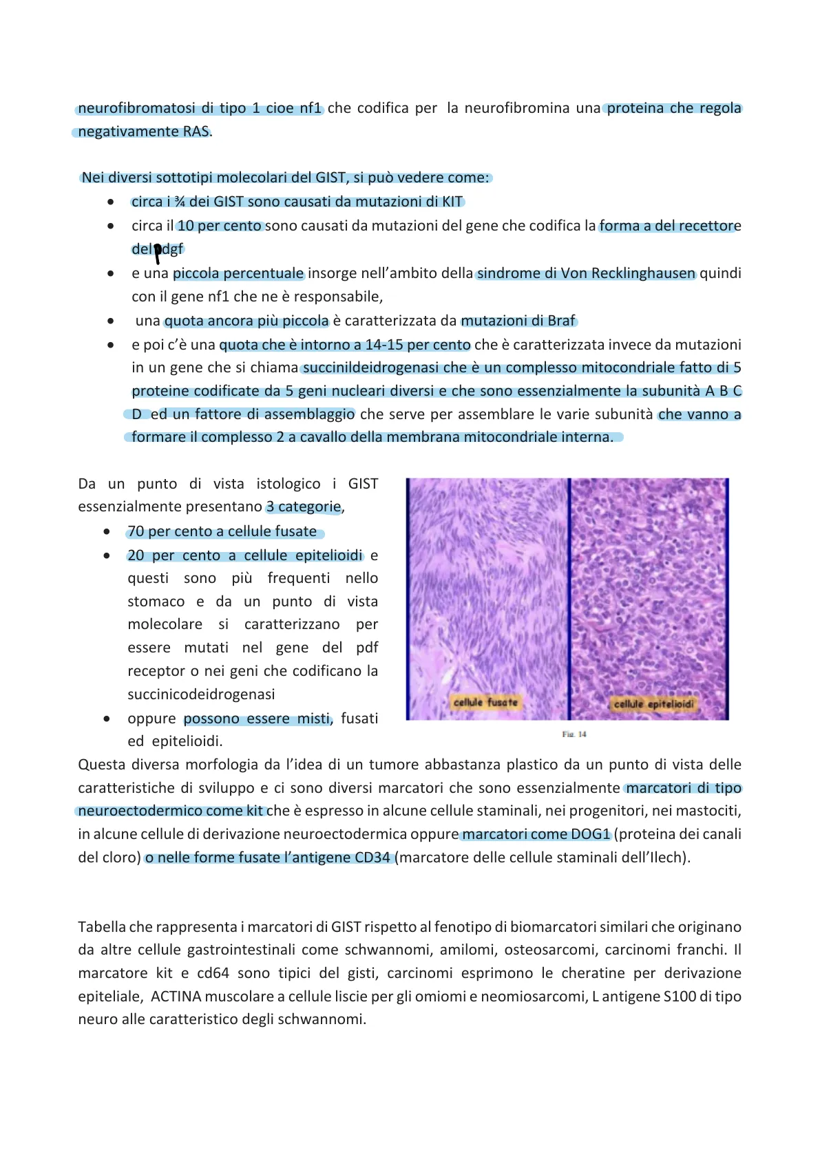 Tabella che rappresenta i marcatori di GIST rispetto al fenotipo di biomarcatori similari che originano da altre cellule gastrointestinali come schwannomi, amilomi, osteosarcomi, carcinomi franchi. Il marcatore kit e cd64 sono tipici del gisti, carcinomi esprimono le cheratine per derivazione epiteliale, ACTINA muscolare a cellule liscie per gli omiomi e neomiosarcomi, Lantigene S100 di tipo neuro alle caratteristico degli schwannomi.IMMUNOISTOCHIMICA