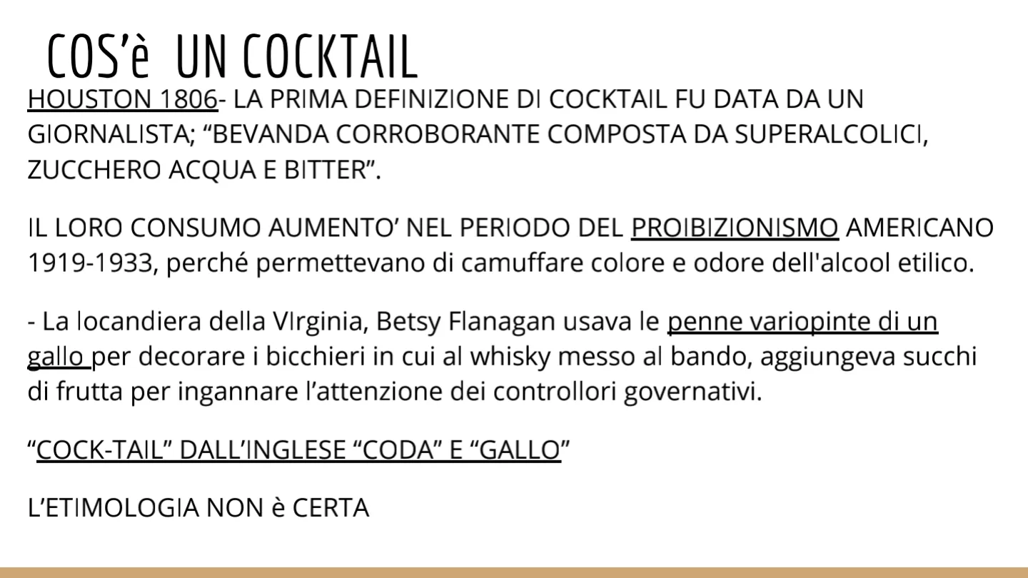 HOUSTON 1806- LA PRIMA DEFINIZIONE DI COCKTAIL FU DATA DA UN GIORNALISTA; "BEVANDA CORROBORANTE COMPOSTA DA SUPERALCOLICI, ZUCCHERO ACQUA E BITTER". IL LORO CONSUMO AUMENTO' NEL PERIODO DEL PROIBIZIONISMO AMERICANO 1919-1933, perché permettevano di camuffare colore e odore dell'alcool etilico.