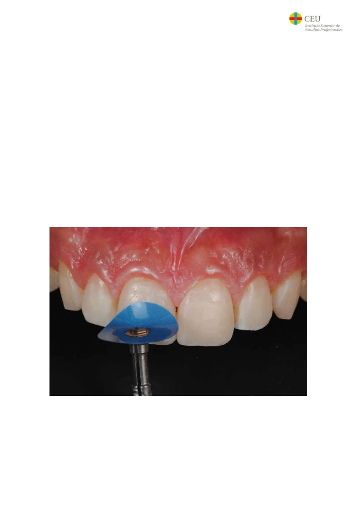 ·Dischi flessibili: È uno dei sistemi più efficaci per la lucidatura di superfici piane, con eccellenti superfici lisce e un'elevata brillantezza. I più utilizzati sono in poliuretano con ossido di alluminio, con diversi spessori e granulometrie, codificati per colore. Vengono utilizzati a bassa velocità, a intermittenza e senza esercitare pressione, poiché sono molto flessibili e si adattano al dente e al restauro. Sono accoppiati a un mandrino e il mandrino viene inserito nel contrangolo. Quelli più spessi devono essere irrigati con acqua per ridurre il calore e l'attrito.CEU Instituto Superior de Estudios Profesionales