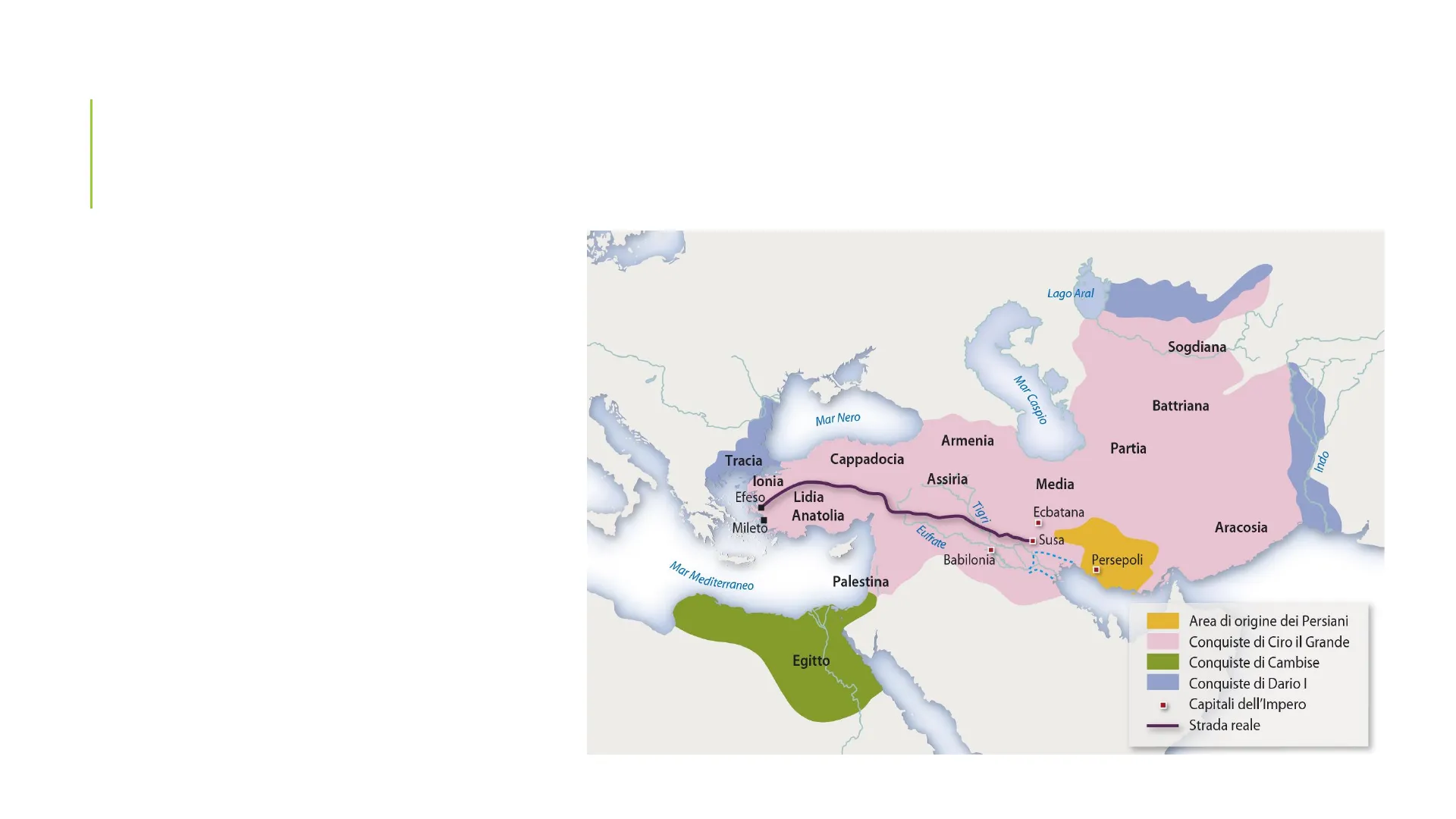 Lago Aral Sogdiana Mar Caspio Battriana Mar Nero Armenia Partia Cappadocia opu] lonia Assiria Media Lidia Tigri Ecbatana Mileto Eufrate Susa Babilonia Persepoli Mar Mediterraneo Palestina Area di origine dei Persiani Conquiste di Ciro il Grande Egitto Conquiste di Cambise Conquiste di Dario I Capitali dell'Impero - Strada reale Tracia Efeso Anatolia Aracosia
