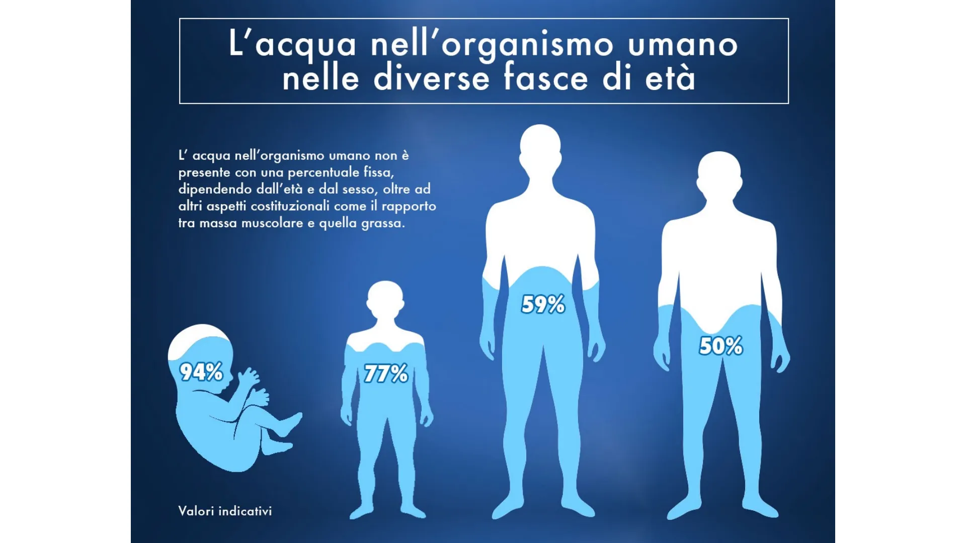 L'acqua nell'organismo umano non è presente con una percentuale fissa, dipendendo dall'età e dal sesso, oltre ad altri aspetti costituzionali come il rapporto tra massa muscolare e quella grassa.