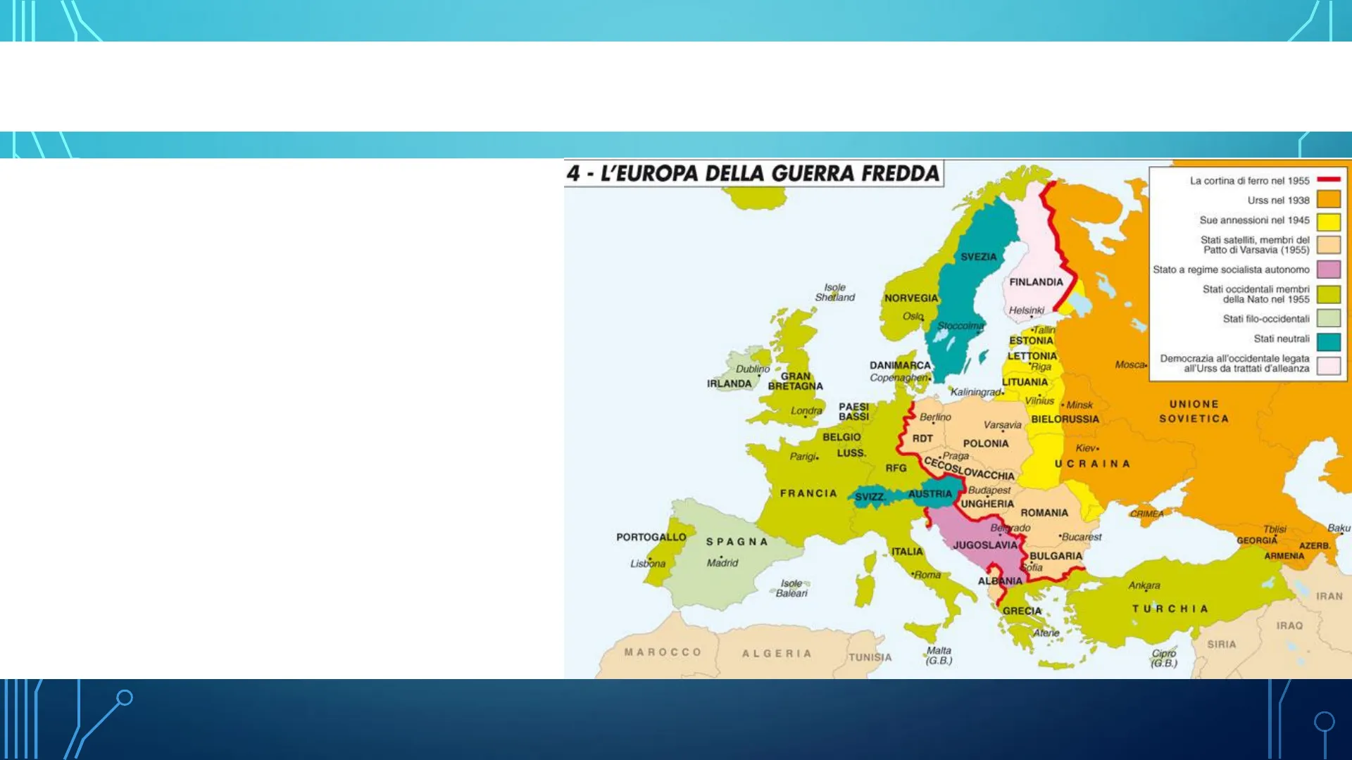 4 - L'EUROPA DELLA GUERRA FREDDA La cortina di ferro nel 1955 Urss nel 1938 Sue annessioni nel 1945 SVEZIA Stato a regime socialista autonomo FINLANDIA Isole Shetland NORVEGIA Helsinki Oslo Stati filo-occidentali Stoccolma Stati neutrali Dublino IRLANDA GRAN BRETAGNA LITUANIA Kaliningrad- Londra PAESI BASSI Berlino BIELORUSSIA Varsavia RDT POLONIA Parigi. ·Praga RFG CECOSLOVACCHIA FRANCIA ·SVIZZ AUSTRIA Budapest UNGHERIA ROMANIA CRIMEA Belgrado Tbilisi GEORGIA Baku PORTOGALLO SPAGNA AZERB. ITALIA BULGARIA ofia ARMENIA Lisbona Madrid ·Roma ALBANIA Ankara IRAN GRECIA TURCHIA IRAQ Aterie MAROCCO ALGERIA TUNISIA Malta (G.B.) Cipro (G.B.) DANIMARCA Copenaghen. Mosca- Democrazia all'occidentale legata all'Urss da trattati d'alleanza Vilnius - Minsk UNIONE SOVIETICA BELGIO LUSS Kiev· UCRAINA ·Bucarest JUGOSLAVIA Isole Baleari SIRIA Stati satelliti, membri del Patto di Varsavia (1955) Stati occidentali membri della Nato nel 1955 ·Tallin ESTONIA LETTONIA ·RigaIL MONDO IN DUE BLOCCHI