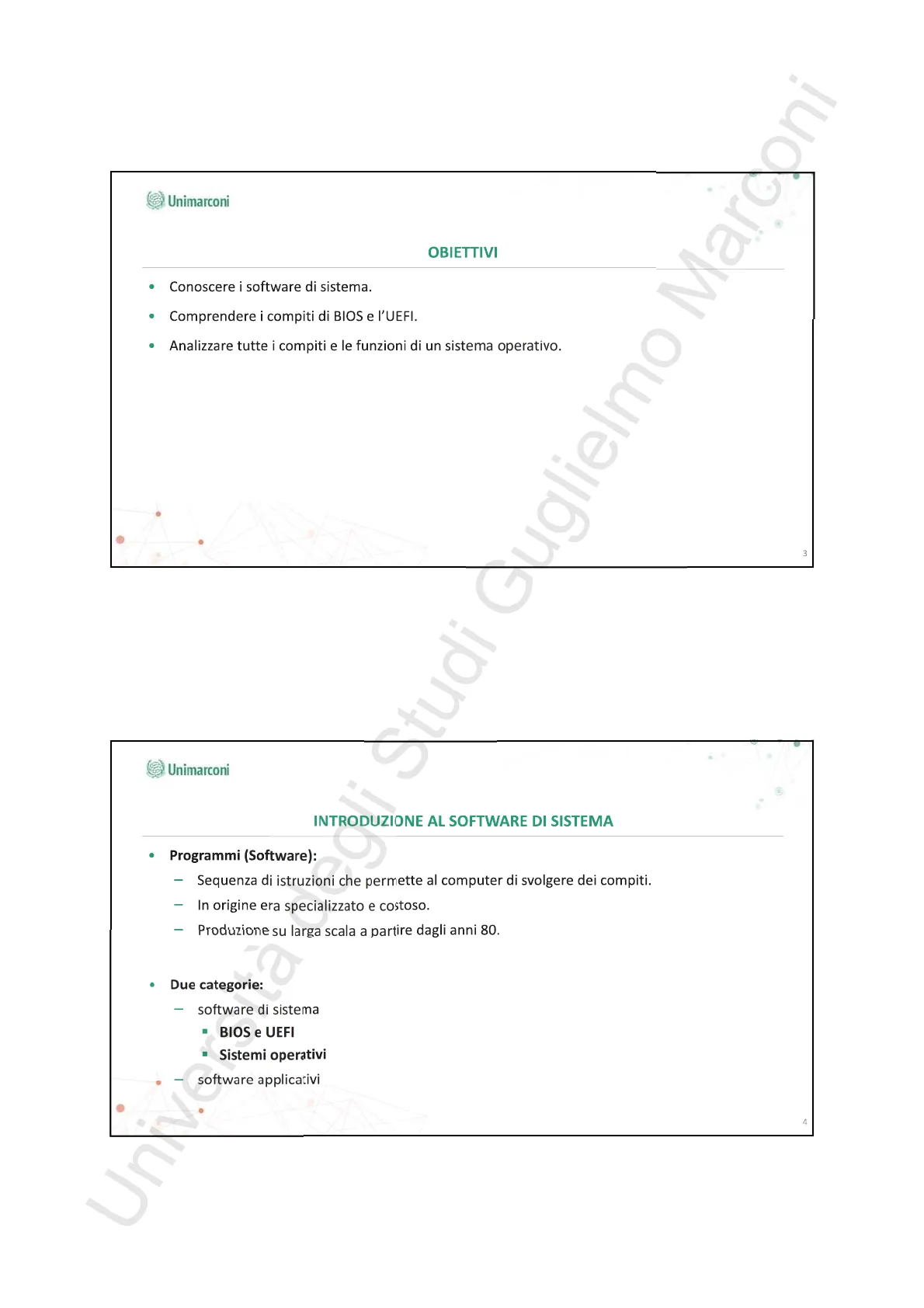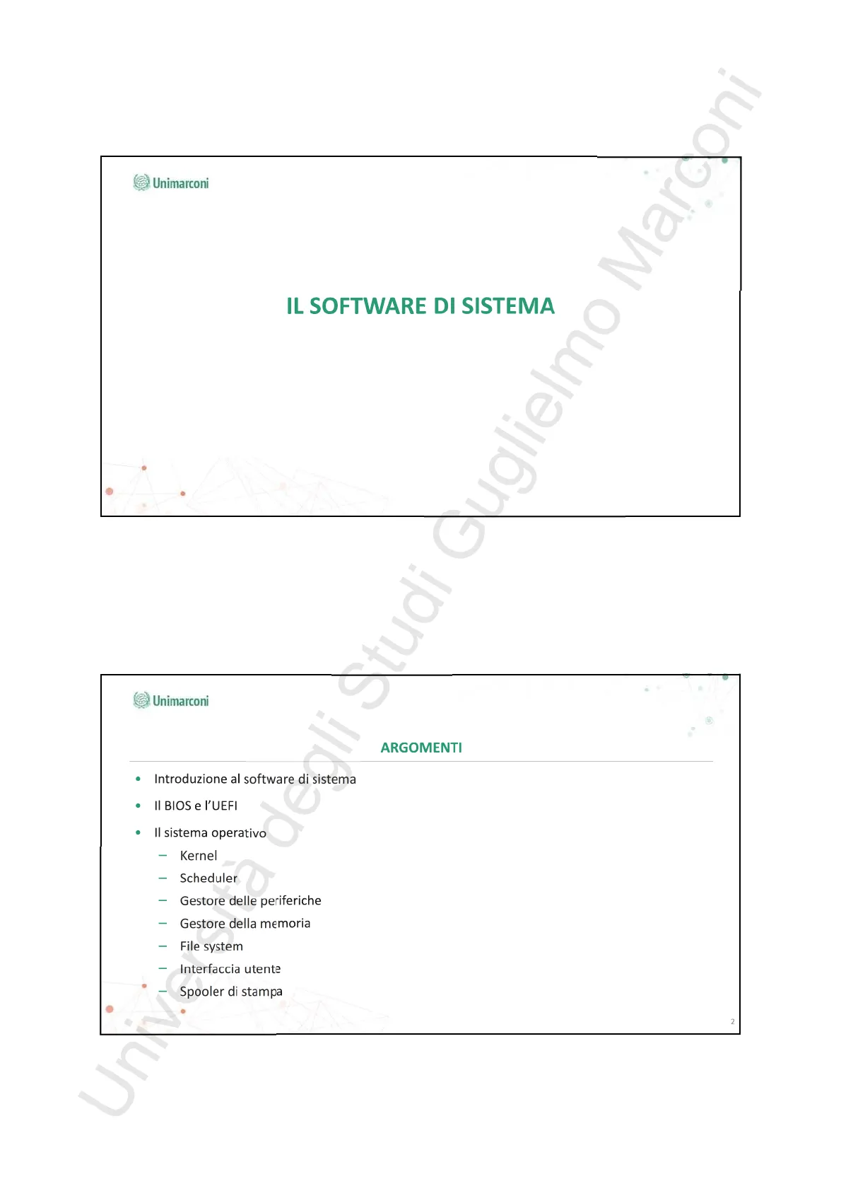 Slide da Unimarconi su Il Software di Sistema. La Pdf, pensata per studenti universitari di Informatica, esplora in dettaglio il software di sistema, includendo BIOS, UEFI, kernel, scheduler e gestori di periferiche e memoria, fornendo una comprensione approfondita delle loro funzioni.
