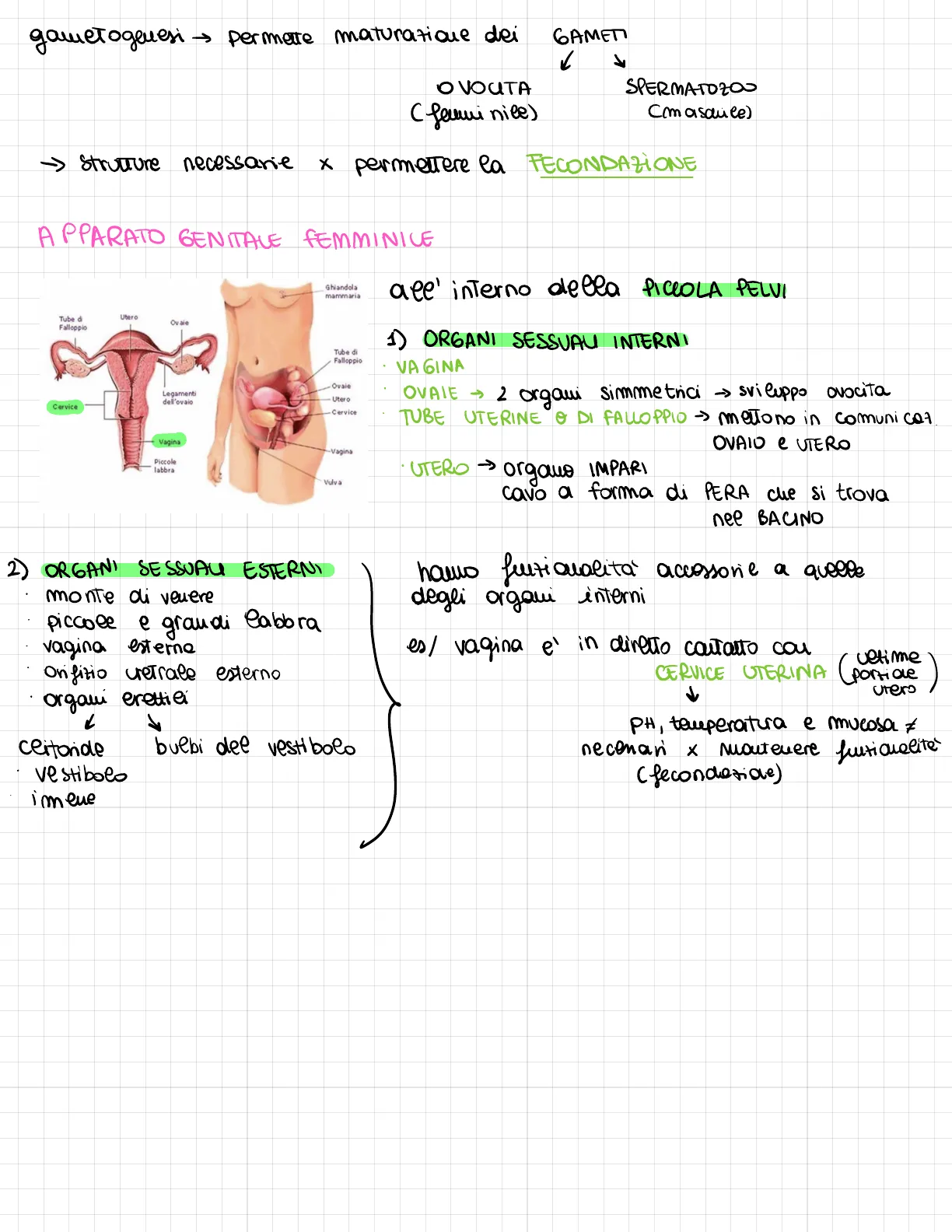 1) ORGANI SESSUALI INTERNI · VA GINA . OVAIE > 2 organi simmetrici -> sviluppo ovocita . TUBE UTERINE O DI FALLOPPIO -> mettono in comunicat OVAIO e UTERO UTERO > organo IMPARI cavo a forma di PERA che si trova nel BACINO