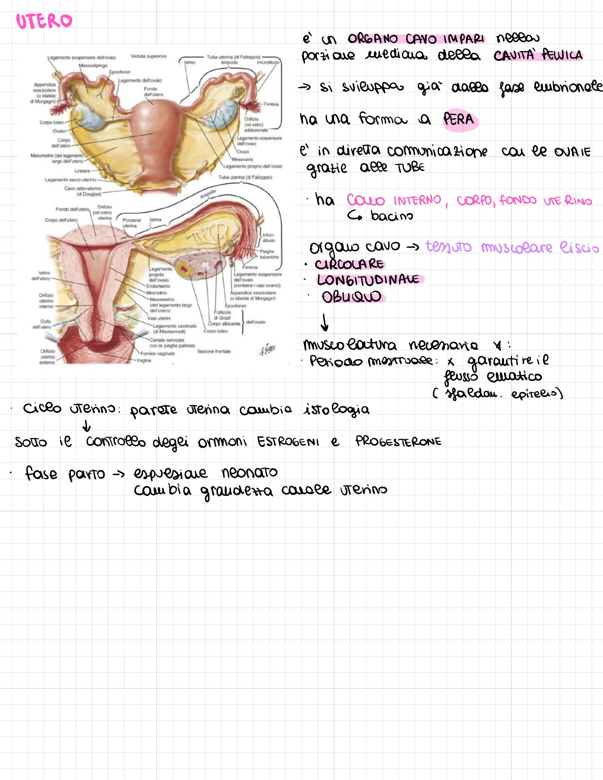 ETA NEONATALE Cambiamenti con l'età e organizzazione della muscolatura ETÀ ADULTA parete rosea 5 pareti // > presenza del CICLO MESTRUALE 7 NULLIPARA Alla pubertà durante ciclo ovarico cambia vascolariz. C. ratura vasi superfici. rivolti verso emne per mezzo di ESTROGENI Adulta (nullipara) => sfaldamento epitelio Adulta (pluripara) Netter dimension ? utero + pallido 1 PLURIPARA quando alliene impianto vella parete posteriore del lume si forma SINCIZIO TROPOBLASTO proprie > vascolarizzazione embriae 1 menopausa anlita ciclo -> ormoni senvali nai + prodotti da OVALE/ PLACENTA 2 da # organi