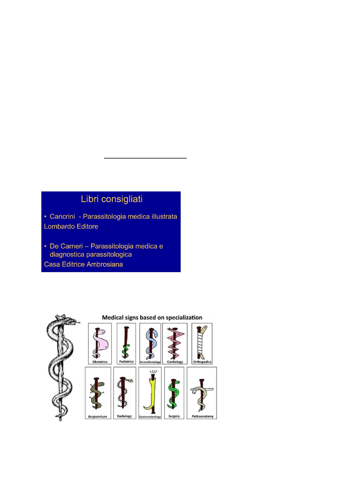 Il Bastone di Esculapio Il simbolo del Bastone di Esculapio è composto da un bastone e da un serpente e ogni specialistica lo rappresenta in maniera diversa. Tra questi simboli si può però notare l'assenza della Parassitologia. Questo perché la Parassitologia è una materia un po' negletta dal punto di vista delle scienze mediche, per tanti motivi di cui poi parleremo.