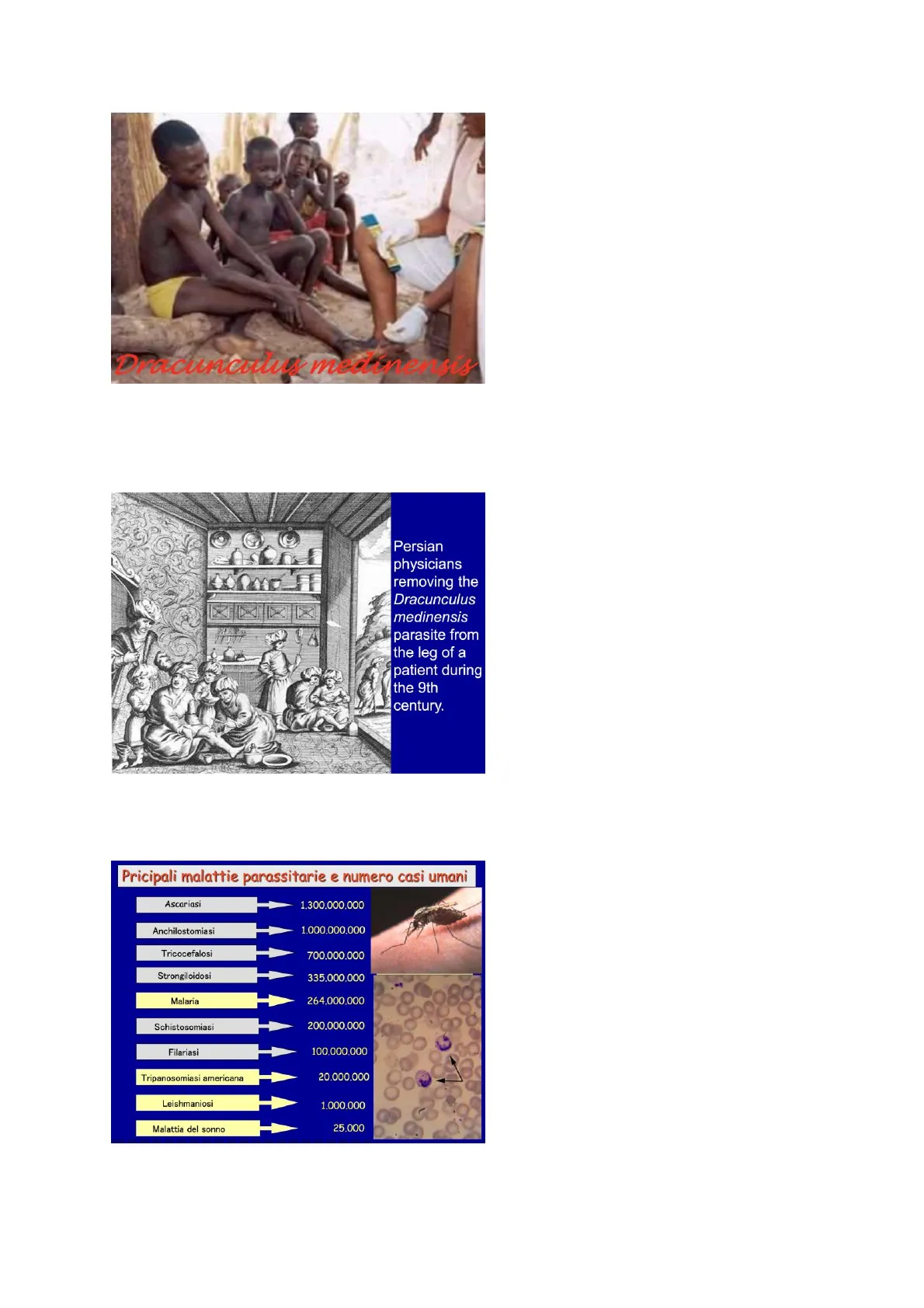 Dracunculus medinensis Dracunculus medinensis, detto anche "Verme di Medina" è un "vermetto" la cui femmina depone le sue larve all'esterno per trasmettere la progenie creando un'ulcera negli arti inferiori, uscendo fuori da quest'ulcera e deponendo attraverso il suo utero delle larve, di solito in acqua. Persian physicians removing the Dracunculus medinensis parasite from the leg of a patient during the 9th century. Quindi questo verme esce fuori e tradizionalmente questo verme veniva estratto facendo uno o due giri ogni giorno intorno a un bastoncino. Veniva quindi tirato via con il bastone, facendoci attorcigliare attorno al verme. Una cosa molto molto tradizionale ma ancora utilizzata. È possibile vedere la pratica in atto in questa stampa antica persiana, nella quale il bastone tira fuori questo verme. É quindi la Parassitologia a dare il simbolo alla Medicina, non attraverso un serpente ma tramite il verme di Medina.