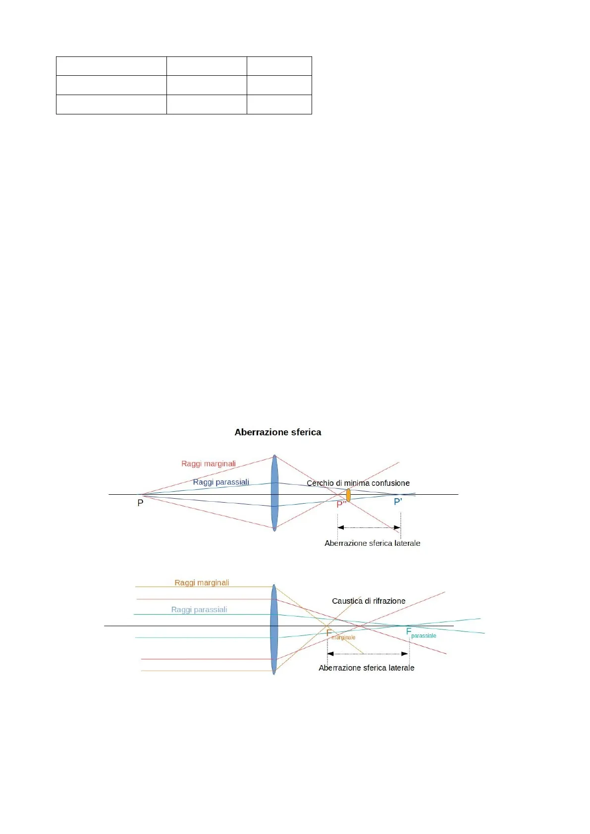 Aberrazione sferica Raggi marginali Raggi parassiali Cerchio di minima confusione P P" P Aberrazione sferica laterale Raggi marginali Caustica di rifrazione Raggi parassiali F parassiale marginale Aberrazione sferica laterale