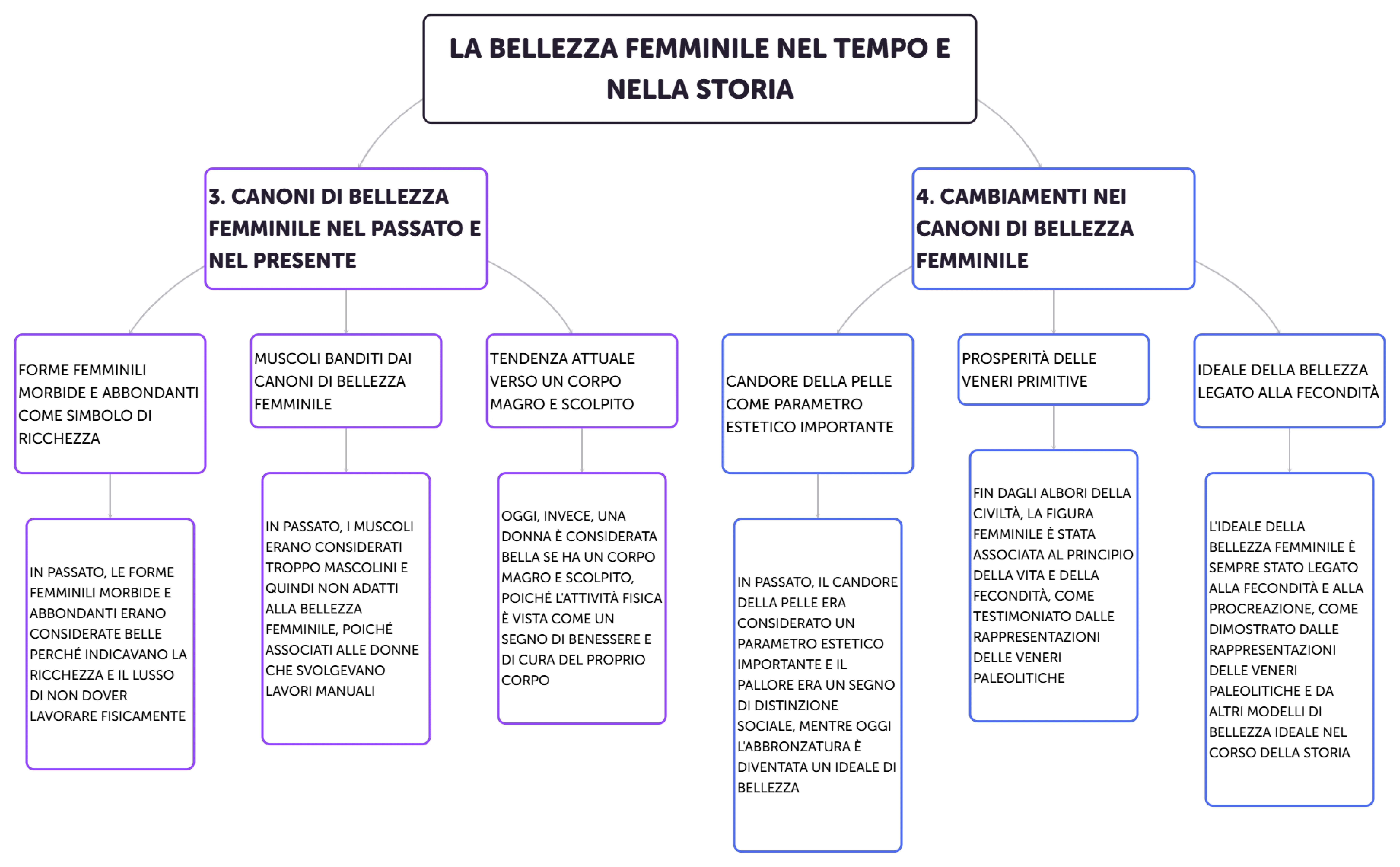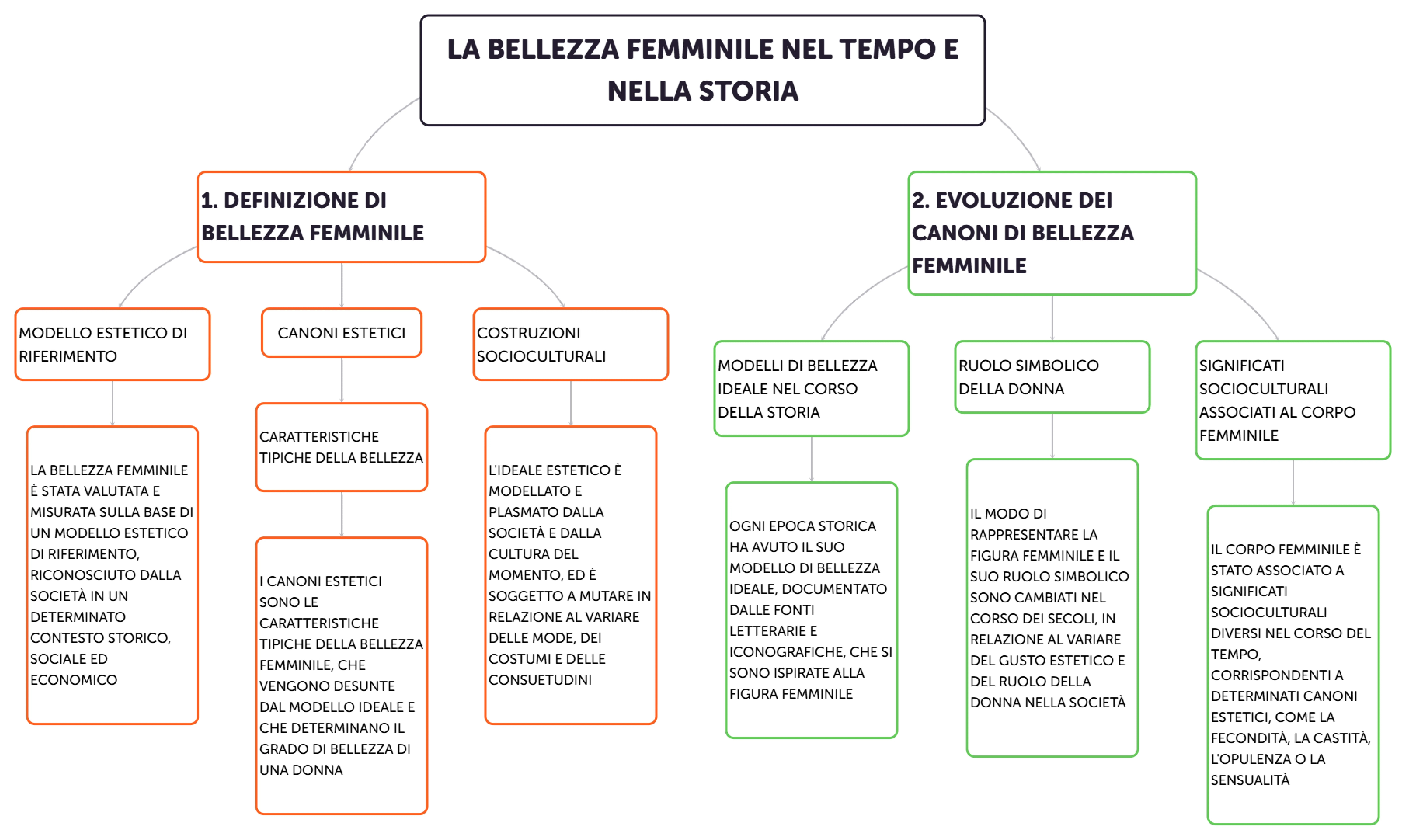 Schemi dall'Università sulla bellezza femminile nel tempo e nella storia. I riassunti esplorano l'evoluzione dei canoni estetici e il ruolo simbolico della donna, dalla Grecia antica al Medioevo, per la materia Storia.