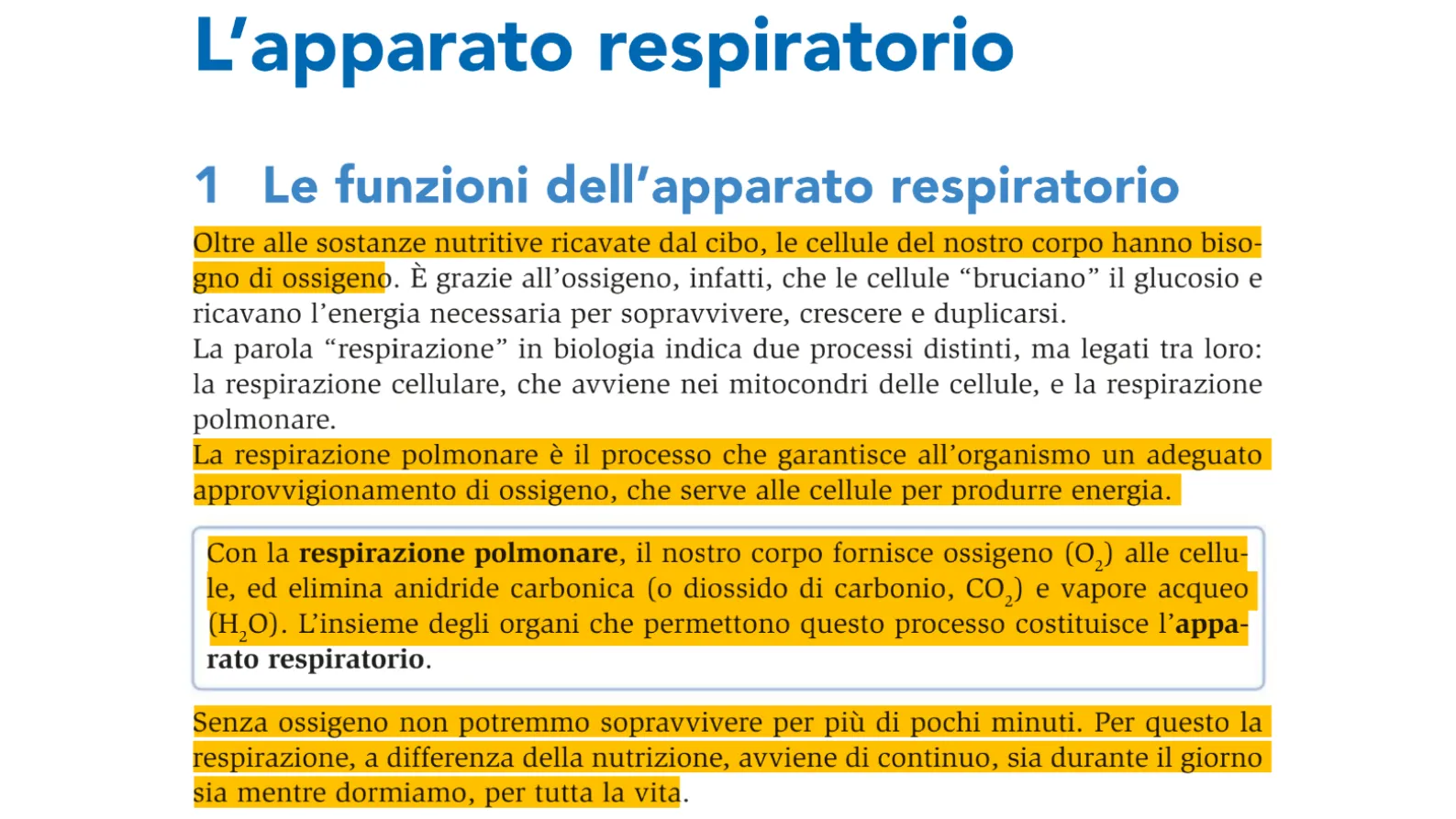 Con la respirazione polmonare, il nostro corpo fornisce ossigeno (O2) alle cellu- le, ed elimina anidride carbonica (o diossido di carbonio, CO2) e vapore acqueo (H2O). L'insieme degli organi che permettono questo processo costituisce l'appa- rato respiratorio.