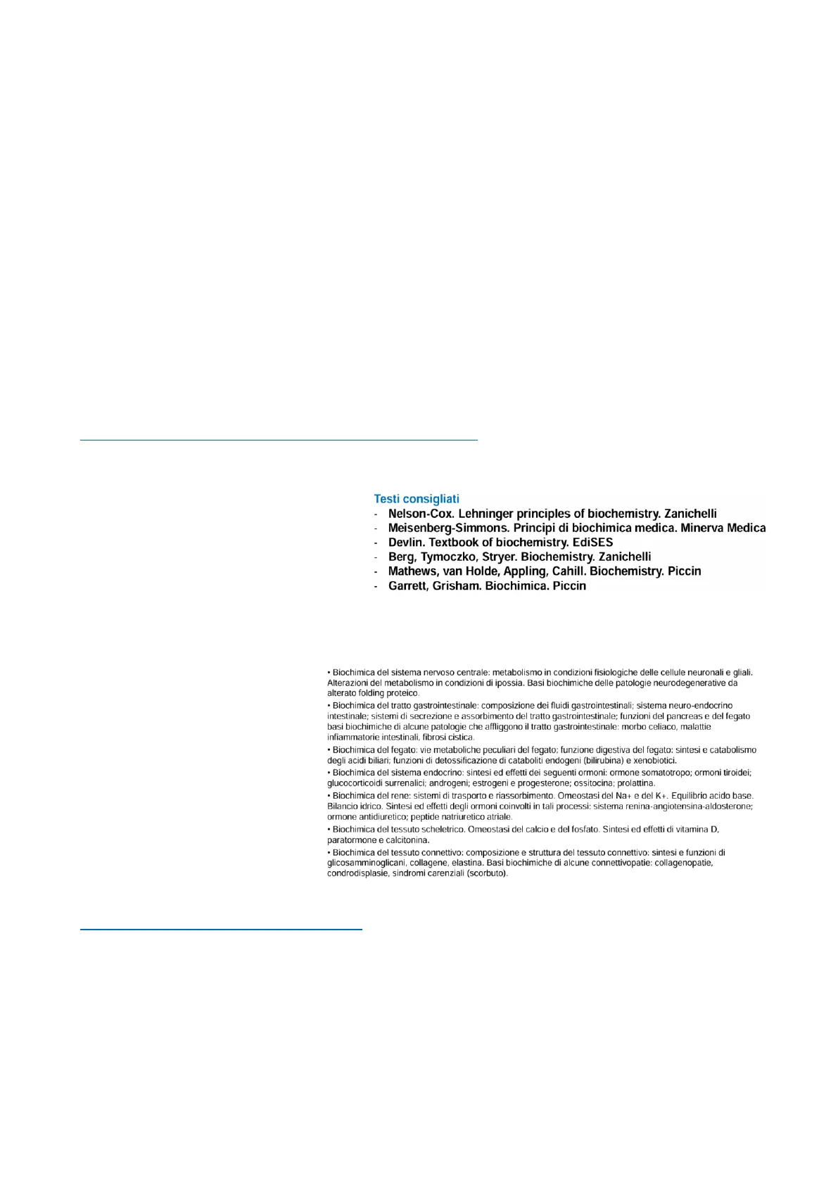 I libri consigliati sono gli stessi presentati all'inizio del corso di biochimica metabolica, perché un libro solo per biochimica d'organo non esiste (alcuni testi hanno delle parti più approfondite e altri meno), quindi basta prendere le informazioni da un eventuale testo acquistato ad inizio anno. In linea di massima, però, ciò che c'è nelle diapositive, è tutto quello che può essere argomento d'esame.