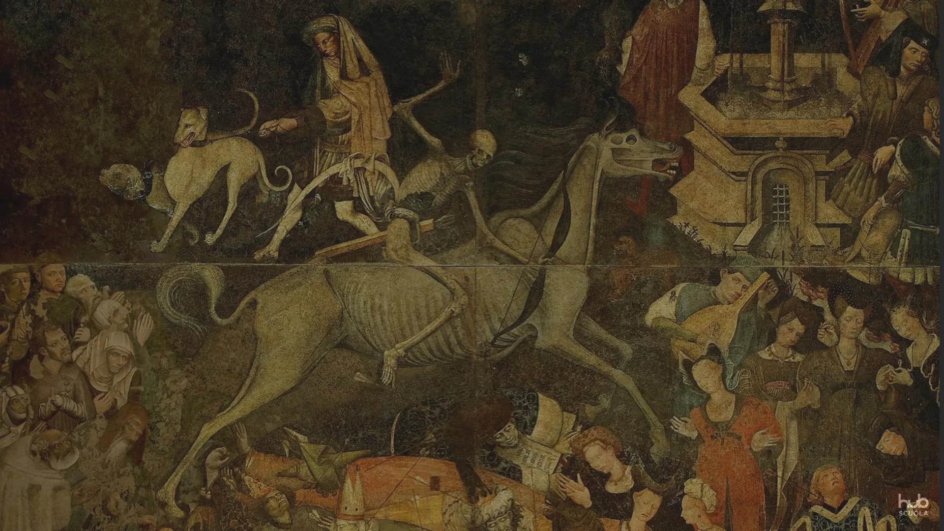 hub SCUOLALA PESTE NERA E LA CRISI DEL TRECENTO / L'EPIDEMIA DI PESTE La velocissima diffusione della peste è una catastrofe immensa per gli abitanti di tutto il mondo conosciuto. Al di là dei suoi risvolti tragici, l'epidemia dimostra che Asia, Europa e Africa settentrionale sono un mondo unito da strettissimi legami commerciali, umani e, di conseguenza, anche sanitari. hub SCUOLALA PESTE NERA E LA CRISI DEL TRECENTO / L'EPIDEMIA DI PESTE Il popolo ha molta paura del contagio: le persone che contraggono la malattia vengono spesso abbandonate e tutte le cose che hanno toccato vengono bruciate. Nessuna autorità, né politica né religiosa, riesce a fermare quella che a molti sembra la fine del mondo. hub SCUOLALA PESTE NERA E LA CRISI DEL TRECENTO / L'EPIDEMIA DI PESTE Purtroppo la disperazione e il terrore si associano alla ricerca di un capro espiatorio da considerare responsabile dell'epidemia. Superstizione, angoscia e paura generano vari comportamenti molto gravi. hub SCUOLALA PESTE NERA E LA CRISI DEL TRECENTO / L'EPIDEMIA DI PESTE L'ira della popolazione si concentra ancora una volta sugli ebrei, che in molte regioni vengono massacrati. Si ricordano in particolare le vicende dei flagellanti, una setta di fanatici che perseguita le comunità ebraiche. hub SCUOLALA PESTE NERA E LA CRISI DEL TRECENTO / L'EPIDEMIA DI PESTE Per i sopravvissuti, l'epidemia di peste segna la fine di un mondo. Per questo motivo alcuni storici vedono in questo passaggio l'inizio del tramonto del Medioevo o, da un altro punto di vista, dell'alba della modernità. hub SCUOLALA PESTE NERA E LA CRISI DEL TRECENTO / L'EPIDEMIA DI PESTE L'epidemia di peste ha molte conseguenze sul mondo che lascia, una volta finita: