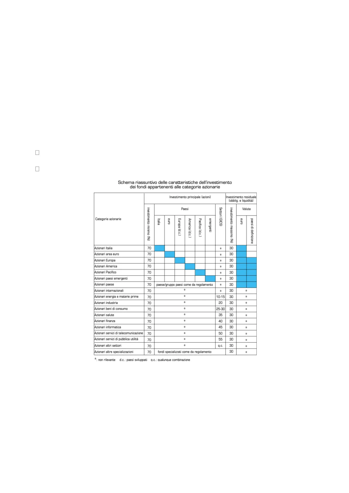Azionari Italia 70 . 30 Azionari area euro 70 30 Azionari Europa 70 . 30 Azionari America 70 30 Azionari Pacifico 70 30 Azionari paesi emergenti 70 30 Azionari paese 70 paese/gruppo paesi come da regolamento 30 Azionari internazionali 70 30 Azionari energia e materie prime 70 10-15 30 Azionari industria 70 20 30 : Azionari beni di consumo 70 25-30 30 Azionari salute 70 35 30 Azionari finanza 70 40 30 Mộ Azionari informatica 70 45 30 Azionari servizi di telecomunicazione 70 50 30 Azionari servizi di pubblica utilità 70 55 30 Azionari altri settori 70 # q.c. 30 . Azionari altre specializzazioni 70 fondi specializzati come da regolamento 30 Settori (GICS) Valuta investimento minimo (%) Paesi #: non rilevante d.c .: paesi sviluppati q.c .: qualunque combinazione