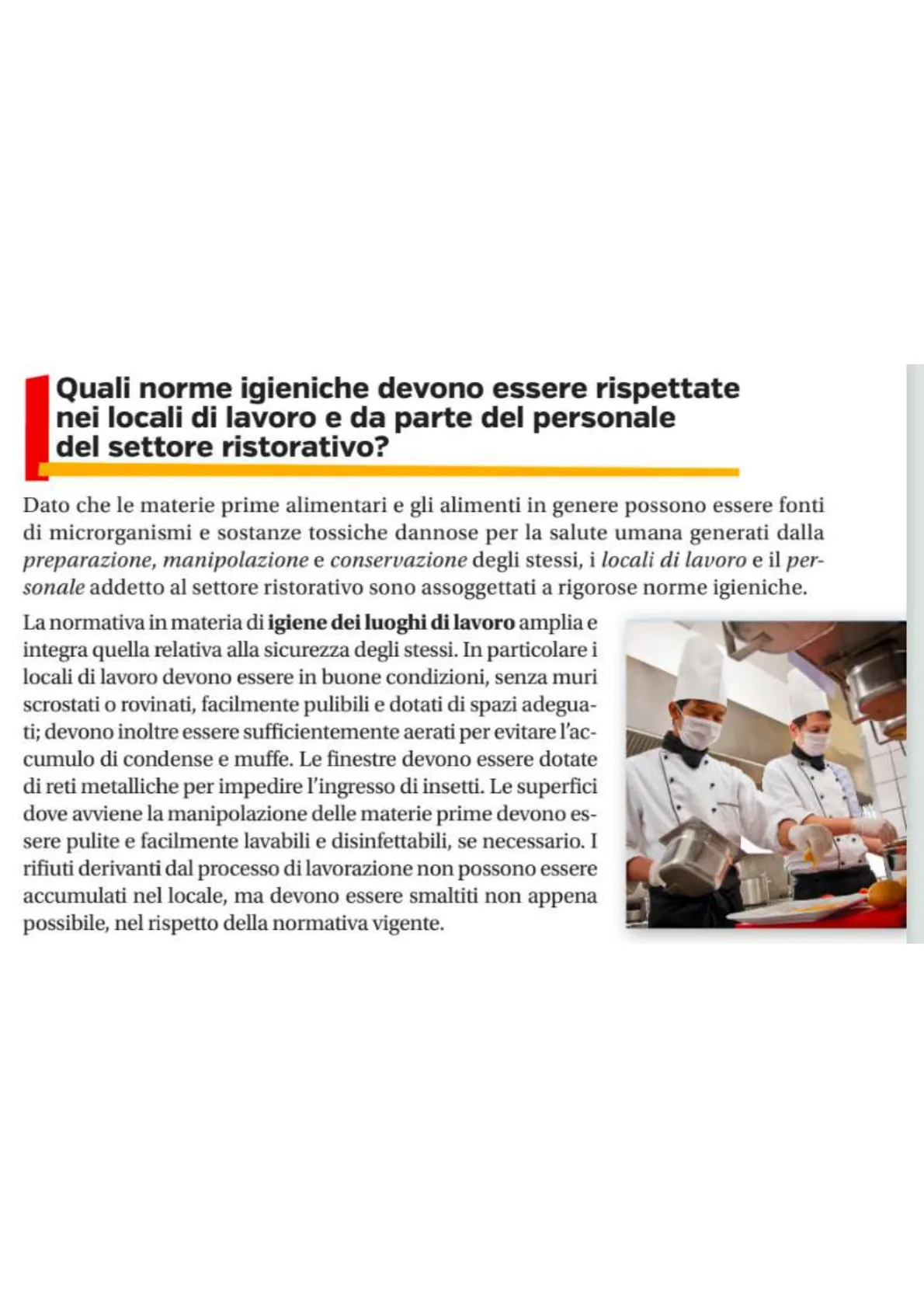 Dato che le materie prime alimentari e gli alimenti in genere possono essere fonti di microrganismi e sostanze tossiche dannose per la salute umana generati dalla preparazione, manipolazione e conservazione degli stessi, i locali di lavoro e il per- sonale addetto al settore ristorativo sono assoggettati a rigorose norme igieniche. La normativa in materia di igiene dei luoghi di lavoro amplia e integra quella relativa alla sicurezza degli stessi. In particolare i locali di lavoro devono essere in buone condizioni, senza muri scrostati o rovinati, facilmente pulibili e dotati di spazi adegua- ti; devono inoltre essere sufficientemente aerati per evitare l'ac- cumulo di condense e muffe. Le finestre devono essere dotate di reti metalliche per impedire l'ingresso di insetti. Le superfici dove avviene la manipolazione delle materie prime devono es- sere pulite e facilmente lavabili e disinfettabili, se necessario. I rifiuti derivanti dal processo di lavorazione non possono essere accumulati nel locale, ma devono essere smaltiti non appena possibile, nel rispetto della normativa vigente.Molti alberghi gestiscono anche un ristorante. Il personale del settore ristorativo (cuochi, camerieri, baristi, pasticceri, fornai, pizzaioli) non deve essere affetto da alcuna malattia o portatore di malattia trasmissibile, non deve avere ferite infette o infezioni di alcun genere. Deve curare scrupolosamente la pulizia personale, soprat- tutto per quanto riguarda le mani, e indossare divise e indumenti puliti e appropriati, come grembiuli, tute e copricapi.