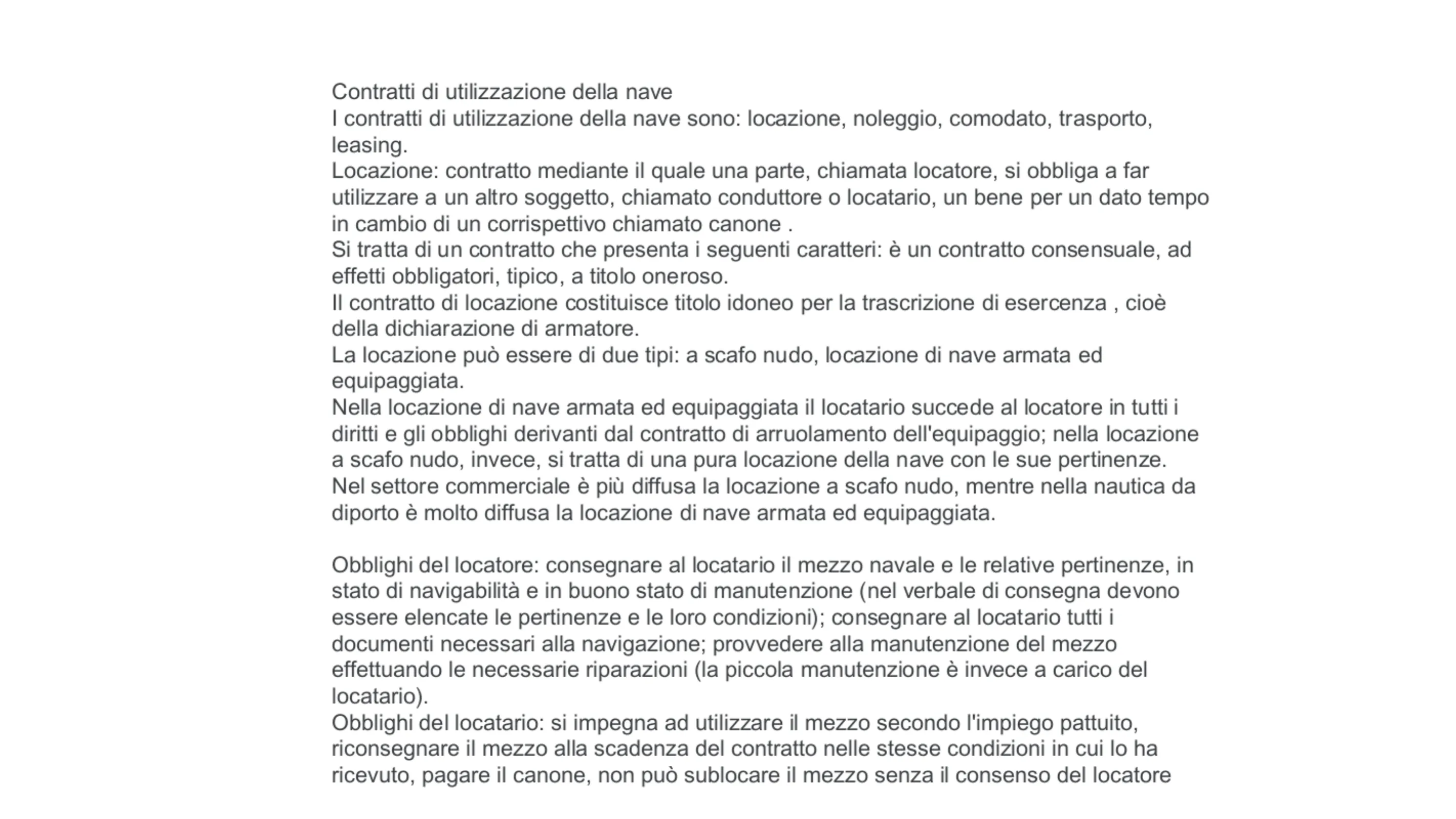 I contratti di utilizzazione della nave sono: locazione, noleggio, comodato, trasporto, leasing.