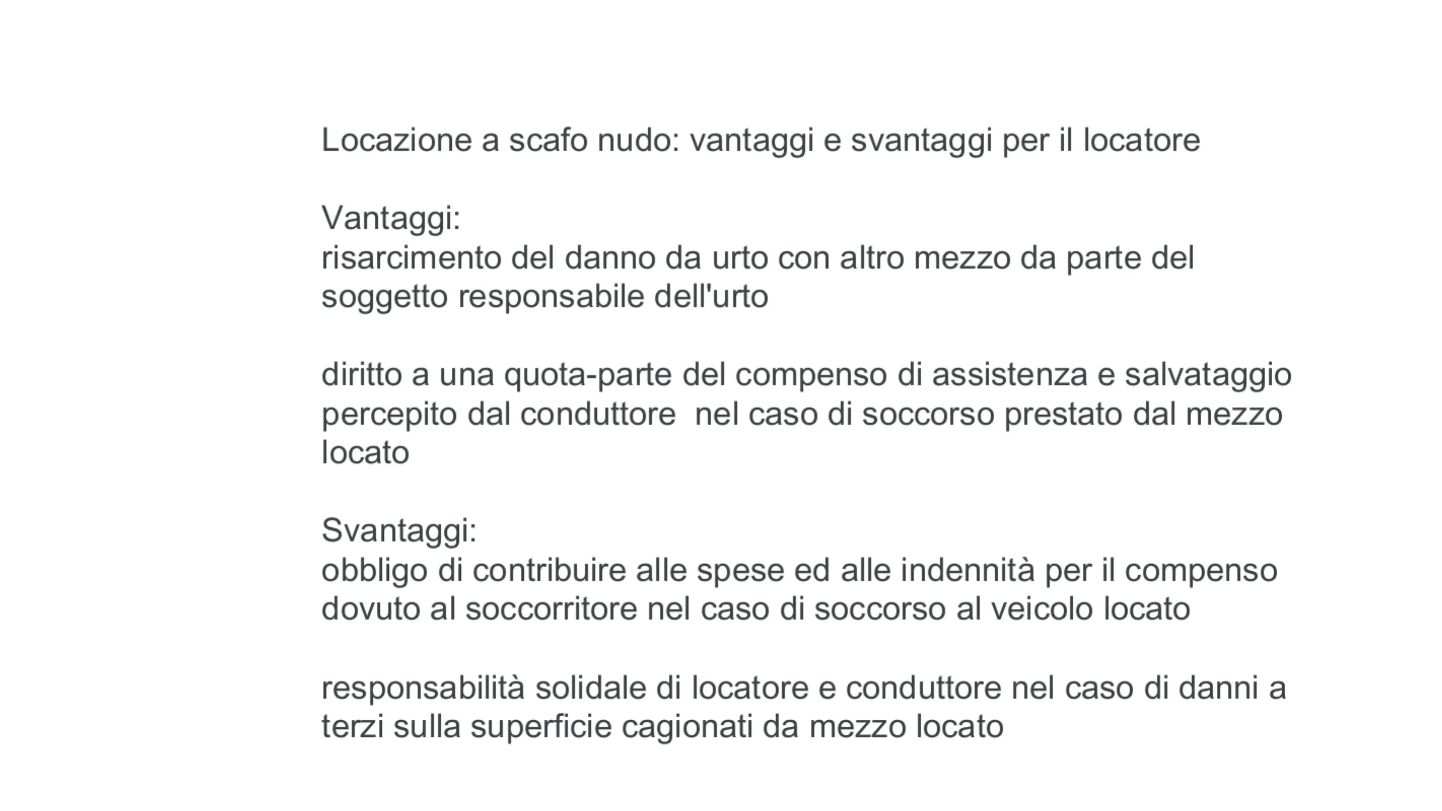 Obblighi del locatario: si impegna ad utilizzare il mezzo secondo l'impiego pattuito, riconsegnare il mezzo alla scadenza del contratto nelle stesse condizioni in cui lo ha ricevuto, pagare il canone, non può sublocare il mezzo senza il consenso del locatore