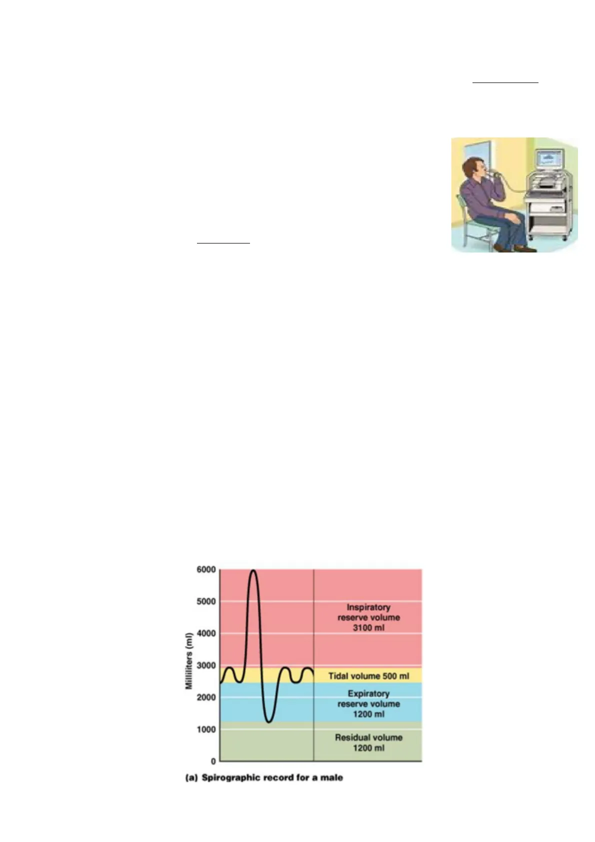 6000 5000 Inspiratory reserve volume 3100 ml Milliliters (ml) 4000 3000 Tidal volume 500 ml 2000 Expiratory reserve volume 1200 ml 1000 Residual volume 1200 ml 0 (a) Spirographic record for a male