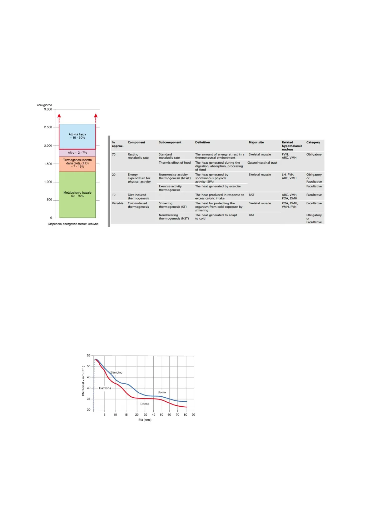 Componenti del dispendio energetico totale in un soggetto adulto sedentario kcal/giorno 3.000 2.500 Attività fisica ~15-30% % Component Subcomponent Definition Major site Related hypothalamic nucleus Category 2.000 approx. Altro ~2 -7% 70 Resting metabolic rate Standard metabolic rate Thermic effect of food The amount of energy at rest in a thermoneutral environment Skeletal muscle PVN ARC, VMH Obligatory The heat generated during the digestion, absorption, processing of food Gastrointestinal tract 1.500 Termogenesi indotta dalla dieta (TID) ~7 -13% 20 Energy expenditure for physical activity Nonexercise activity thermogenesis (NEAT) The heat generated by spontaneous physical activity (SPA) Skeletal muscle LH, PVN, ARC, VMH Obligatory or Facultative Facultative Metabolismo basale 60 - 75% 10 1 The heat produced in response to excess caloric intake BAT ARC, VMH, POA, DMH Facultative 500 Variable Diet-induced thermogenesis Cold-induced thermogenesis Shivering thermogenesis (ST) The heat for protecting the organism from cold exposure by shivering Skeletal muscle POA, DMH, Facultative Nonshivering thermogenesis (NST) The heat generated to adapt to cold BAT Obligatory or Facultative (3) Citando l'immagine sulla sinistra, vengono illustrate le componenti del dispendio energetico totale in un soggetto adulto sedentario. L'immagina sulla destra viene riportata per completezza in quanto vengono descritte in modo più specifico le singole componenti. Inoltre, il professore invita a leggere gli articoli che pubblica su elly. Normalmente, la gran parte dell'energia viene consumata per il mantenimento del metabolismo basale, quindi per far andare avanti tutti i processi fisiologici (60-75%). Poi c'è l'attività fisica, per la quale il consumo è circa del 15-30%. Infine, si trova la termogenesi indotta dalla dieta (7-13%) e altri fattori (2-7%).