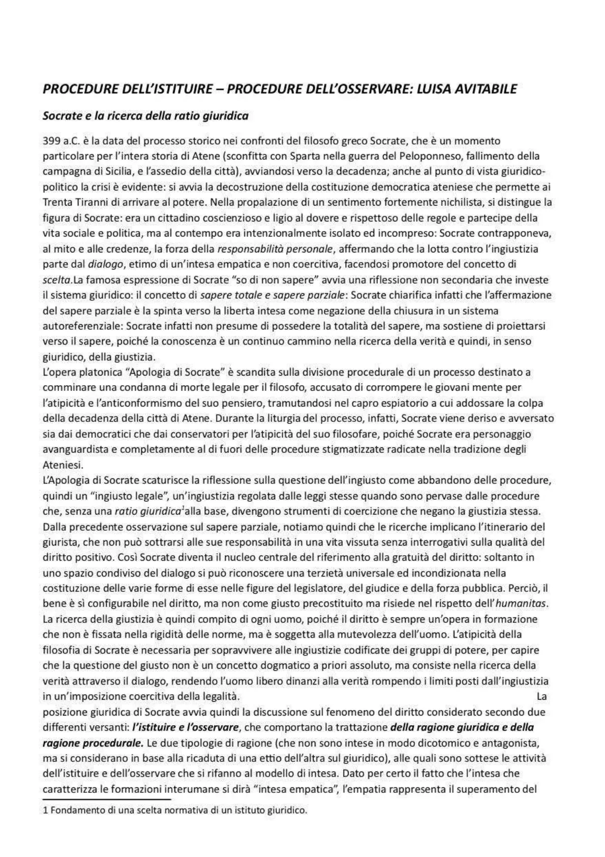 Documento di Luisa Avitabile su "Procedure Dell'istituire - Procedure Dell'osservare". Il Pdf esamina il processo di Socrate e la sua rilevanza per la filosofia giuridica occidentale, esplorando i concetti di legalità e giustizia, adatto a studenti universitari di Diritto.
