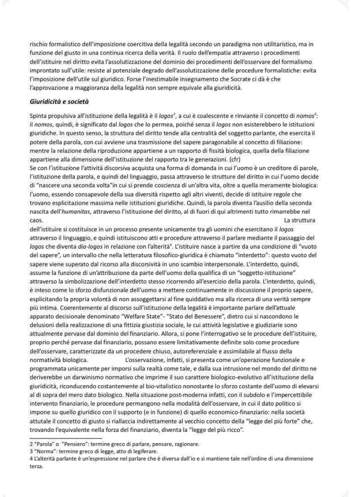 Spinta propulsiva all'istituzione della legalità è il logos', a cui è coalescente e rinviante il concetto di nomos3: il nomos, quindi, è significato dal logos che lo permea, poiché senza il logos non esisterebbero le istituzioni giuridiche. In questo senso, la struttura del diritto tende alla centralità del soggetto parlante, che esercita il potere della parola, con cui avviene una trasmissione del sapere paragonabile al concetto di filiazione: mentre la relazione della riproduzione appartiene a un rapporto di fissità biologica, quella della filiazione appartiene alla dimensione dell'istituzione del rapporto tra le generazioni. (cfr)