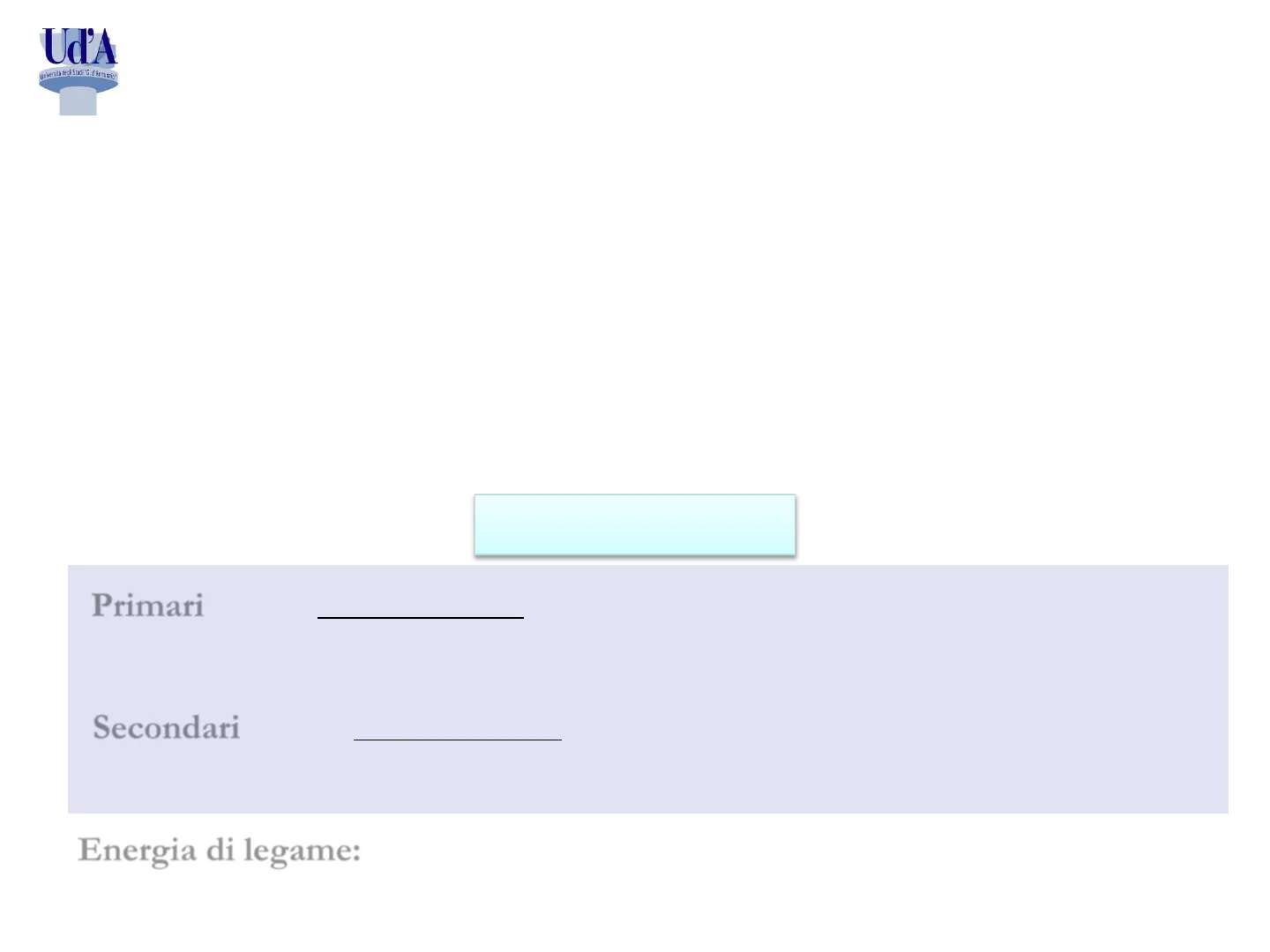Primari: legami intramolecolari (tra atomi) caratterizzati da energie di legame relativamente forti (ionico - covalente - metallico). Secondari: legami intermolecolari (tra molecole) caratterizzati da energie di legame relativamente deboli (interazioni dipolo-dipolo). Energia di legame: energia che bisogna «spendere» per rompere il legame.Uď'A Università degli Studi "G, d'Annunzio"