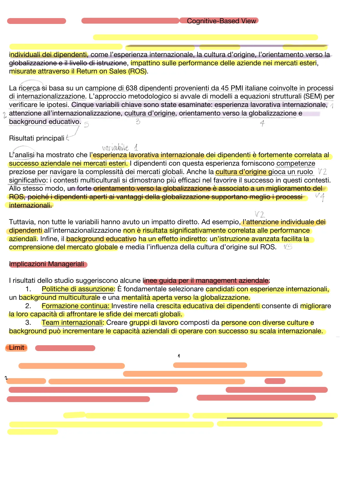Tuttavia, non tutte le variabili hanno avuto un impatto diretto. Ad esempio, l'attenzione individuale dei dipendenti all'internazionalizzazione non è risultata significativamente correlata alle performance aziendali. Infine, il background educativo ha un effetto indiretto: un'istruzione avanzata facilita la comprensione del mercato globale e media l'influenza della cultura d'origine sul ROS. V5