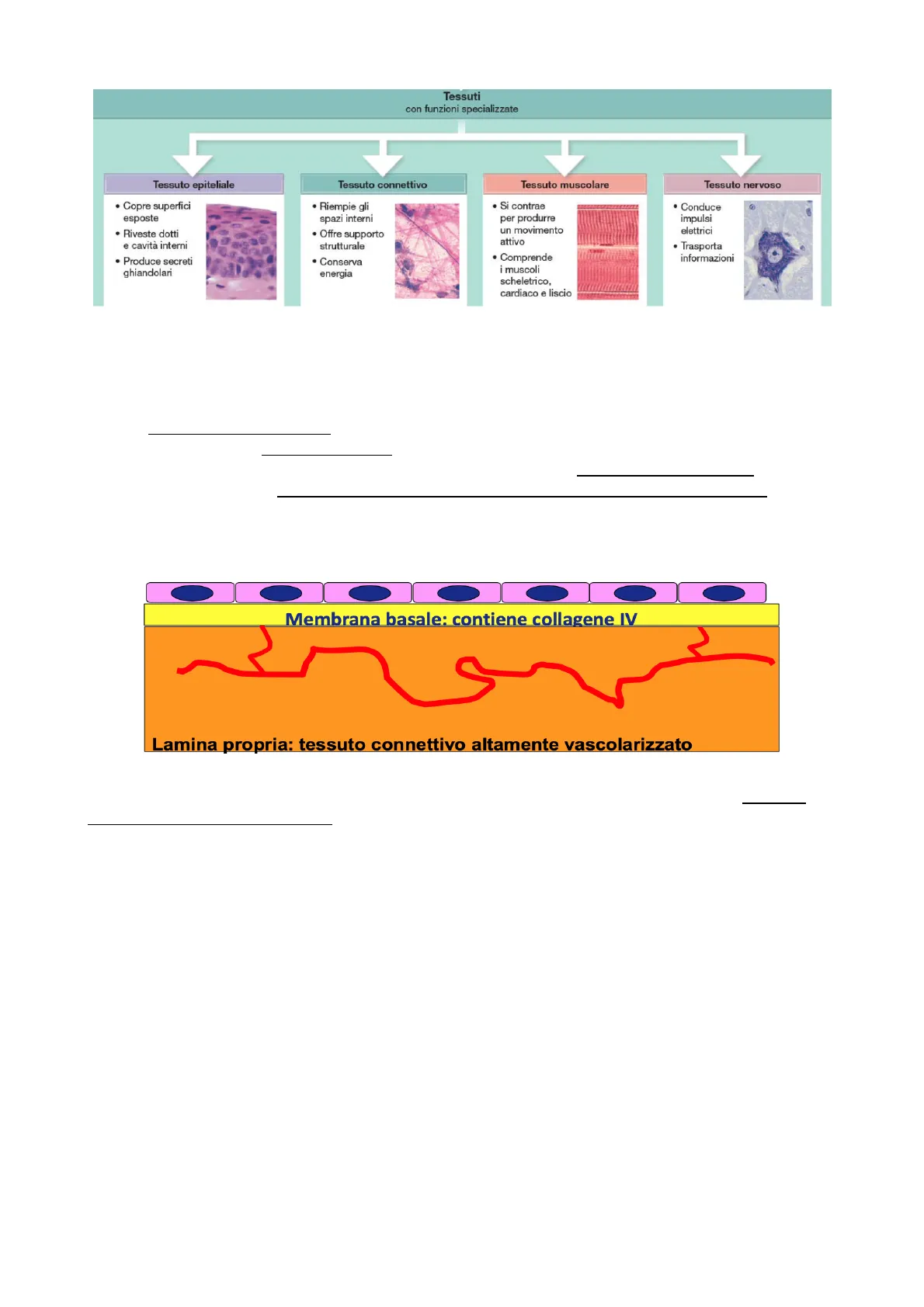 3.1 Tessuto epiteliale Sono quei tessuti che rivestono le superfici, sono anche definiti infatti tessuti di rivestimento. Rivestono le superfici esterne del nostro corpo, come la cute, ma anche l'interno degli organi cavi. Hanno funzione di protezione, per proteggerci dall'esterno ma proteggono alcuni organi da un lume acido, e di assorbimento per assorbire molecole utili dall'esterno e interno. A questa caratteristica si associa altre due capacità, ossia la capacità secernente per gli epiteli ghiandolari e la capacità di raccogliere informazioni dall'ambiente esterno per gli epiteli sensoriali. Nell'ambito di un epitelio di rivestimento possiamo trovare più funzioni, come la funzione di secrezione e la funzione sensoriali, come ad esempio nella cute , quindi parliamo di condizione di coesistenza. Membrana basale: contiene collagene IV Lamina propria: tessuto connettivo altamente vascolarizzato In tutti i tessuti troviamo delle cellule specifiche per quel tessuto e la matrice extracellulare, nell'epitelio ci sono molte più cellule rispetto alla matrice extracellulare, c'è un elevato rapporto tra cellule e matrice. Nell'immagine possiamo notare le cellule in rosa che poggiano sulla membrana basale (in giallo) costituita da collagene IV, ossia la matrice extracellulare. Questo tessuto è un tessuto avascolarizzato, ossia privo di vascolarizzazione. Per ricevere ossigeno e nutrienti è supportato dalla lamina propria, in arancione nell'immagine, un tipo di tessuto connettivo altamente vascolarizzato sempre associato a tessuto epiteliale. Qui, infatti, troviamo i capillari sanguinei che portano nutrienti e ossigeno all'epitelio essendo avascolarizzato. Il tessuto epiteliale presente tre caratteristiche principali: 1. Avascolarizzazione: assenza di vasi nel tessuto epiteliale, quindi necessita della lamina propria per i nutrienti e l'ossigeno 2. Polarità: nella cellula del tessuto epiteliale è sempre possibile riconoscere tre poli, il polo basale, il polo apicale e il polo laterale. Il polo basale è il lato della cellula che posa sulla membrana basale, il polo laterale è il lato della cellula rivolto verso le 6cellule adiacenti e il polo apicale è la parte della cellula opposta al polo basale e guarda verso l'esterno oppure verso il lume degli organi cavi. Il lato apicale può contenere anche delle specializzazioni come ciglia e microvilli, come negli enterociti dell'intestino tenue. Gli organelli all'interno della cellula hanno una particolare distribuzione, generalmente il nucleo è più spostato verso il lato basale mentre gli altri organelli, soprattutto le vescicole, si trovano nel lato apicale. 3. Cellularità: la componente cellulare è più abbondante rispetto alla matrice extracellulare; Membrana basale infatti, la matrice di riduce al sottile strato di membrana basale. Le cellule del tessuto epiteliale creano una barriera per l'ambiente esterno e il lumen dell'organo interno. La barriera può essere più o meno selettiva. Ciglia Microvilli Superficie apicale Apparato di Golgi . Nucleo Mitocondri Superfici basolaterali Il tessuto epiteliale è ricco di giunzioni cellulari, tra le cellule e tra le cellule e la membrana basale. All'interno del dominio laterale possiamo avere vari tipi di giunzioni cellulari, come i desmosomi oppure le gap junction. Le gap junction creano dei canali tra le membrane laterali delle cellule, permettendo continuità tra il citoplasma di cellule adiacenti. A livello del palo basale, posso essere presenti gli emidesmosomi che consentono la connessione fisica tra la grana del lato basale e la matrice cellulare. Le cellule del tessuto epiteliale sono ravvicinate tra di loro, ed essendo ravvicinate tra di loro creano una barriera per l'ambiente esterno e il lume dell'organo interno. Questa barriera può essere, a seconda delle caratteristiche delle giunzioni, più o meno selettiva. Ci saranno epiteli che permettono un elevato scambio di sostanze, come a livello polmonare, oppure non permettono scambio, quindi, creano una barriera meno permissiva.