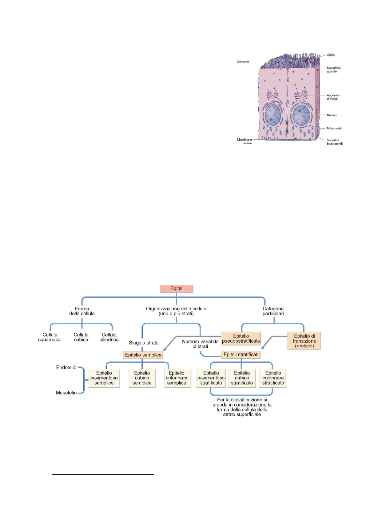 Epiteli Forma della cellula Organizzazione delle cellule (uno o più strati) Categorie particolari Cellula squamosa Cellula cubica Cellula cilindrica Epitelio pseudostratificato Singolo strato Numero variabile di strati Epitelio di transizione (urotelio) Epitelio semplice Epiteli stratificati Endotelio Epitelio pavimentoso semplice Epitelio cubico semplice Epitelio colonnare semplice Epitelio pavimentoso stratificato Epitelio cubico stratificato Epitelio colonnare stratificato Mesotelio Per la classificazione si prende in considerazione la forma della cellula dello strato superficiale I tessuti epiteliali possono essere divisi in base alla composizione morfologica. Questo tipo di classificazione dipende dalla forma delle cellule e dal numero di strati di cellule che possiamo avere nell'epitelio. In base al numero di strati di cellule presenti nel tessuto possiamo avere due tipi di tessuto: · Epitelio semplice: è presente un solo strato di cellule · Epitelio stratificato o composto: le cellule si dispongono su più file. In base alla forma delle cellule possiamo trovare tre tipi di epiteli: 7· Epitelio pavimentoso: la cellula è schiacciata o appiattita, infatti il polo laterale è schiacciato · Epitelio cubico: cellula di forma cubica e i tre poli hanno dimensione simile tra di loro · Epitelio cilindrico/colonnare/bratiprismatico: il polo laterale è quello più sviluppato Unendo la forma delle cellule e il numero di strati delle cellule, gli epiteli possono essere divisi così: · Epitelio pavimentoso semplice: un unico strato di cellule di forma appiattita · Epitelio cubico semplice: un unico strato di cellule di forma cubica · Epitelio cilindrico semplice: un unico strato di cellule di forma cilindrica · Epitelio pavimentoso stratificato: più strati di cellule, ma solo quelle più apicali presentano una forma appiattita · Epitelio cubico stratificato: più strati di cellule, ma solo quelle più apicali presentano una forma cubica. Lo troviamo a livello di dotti escretori di calibro maggiore rispetto a quello semplice, come nel dotto pancreatico. · Epitelio cilindrico stratificato: più strati di cellule, ma solo quelle più apicali presentano una forma cilindrica · Epitelio pseudostratificato · Epitelio di transizione La diversa conformazione del tessuto determina funzioni diverse, quindi li troveremo in diversi organi in base alla loro specifica funzione.
