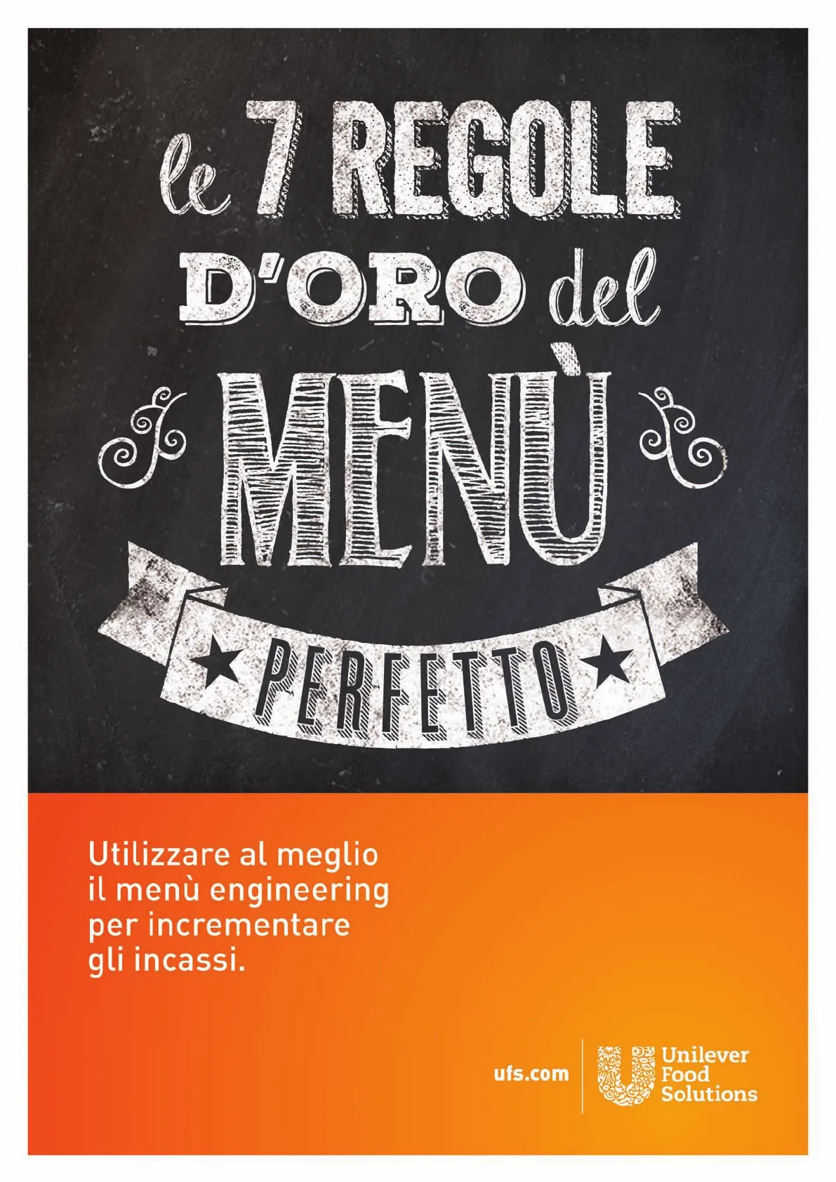 Slide da Unilever Food Solutions su Le 7 Regole d'Oro del Menù Perfetto. Il Pdf illustra il menu engineering, combinando matematica e psicologia per guidare le scelte dei clienti, evidenziando i piatti ad alto guadagno e l'importanza della coerenza del menù con l'identità del locale, includendo la normativa sugli allergeni per la formazione professionale in Economia.