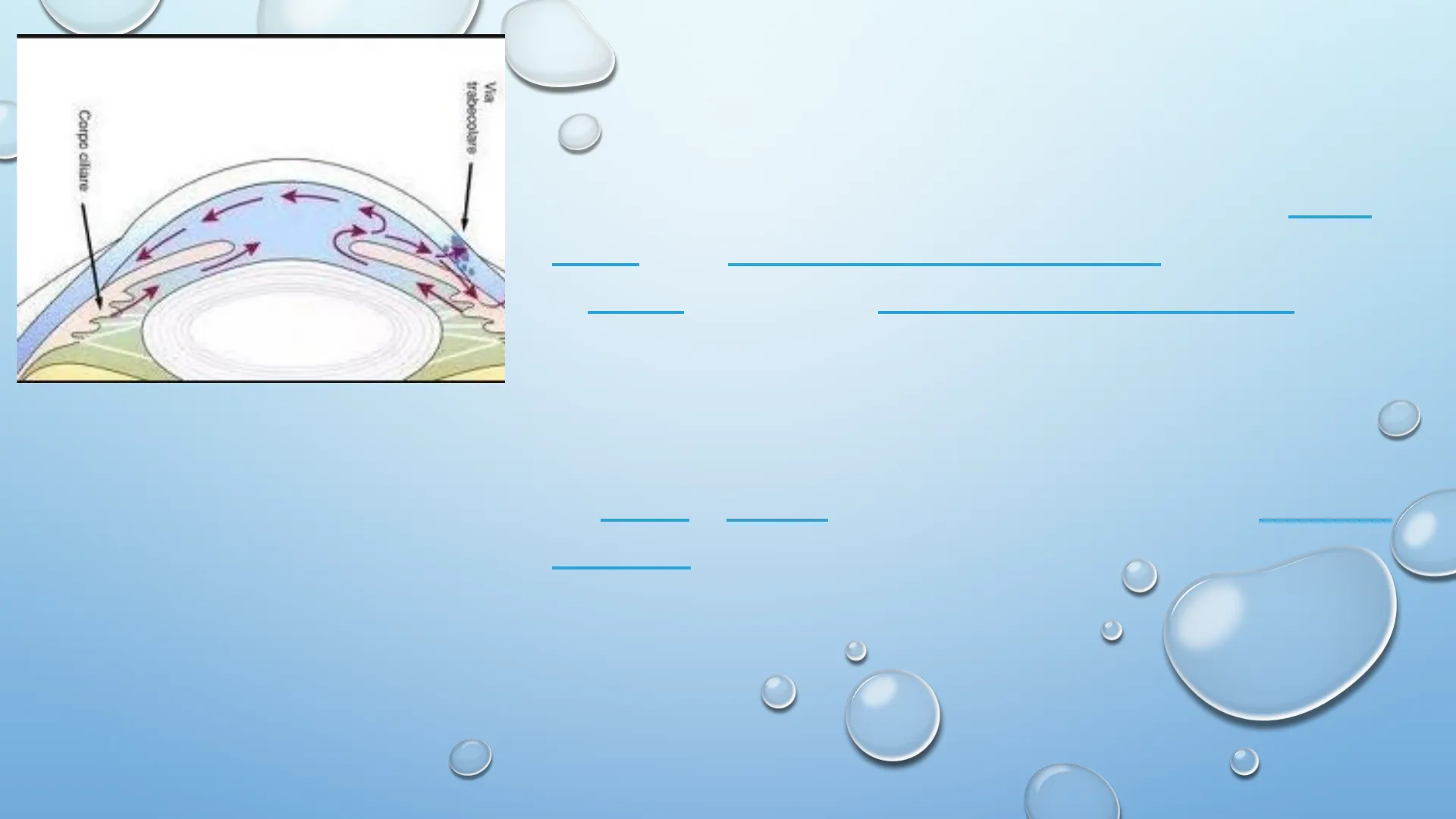 UMOR ACQUEO Viene prodotto dall'epitelio dei processi ciliare del corpo ciliare nella camera posteriore dell'occhio. Attraverso la pupilla circola nella camera anteriore dell'occhio dove viene riassorbito nei suoi bordi.