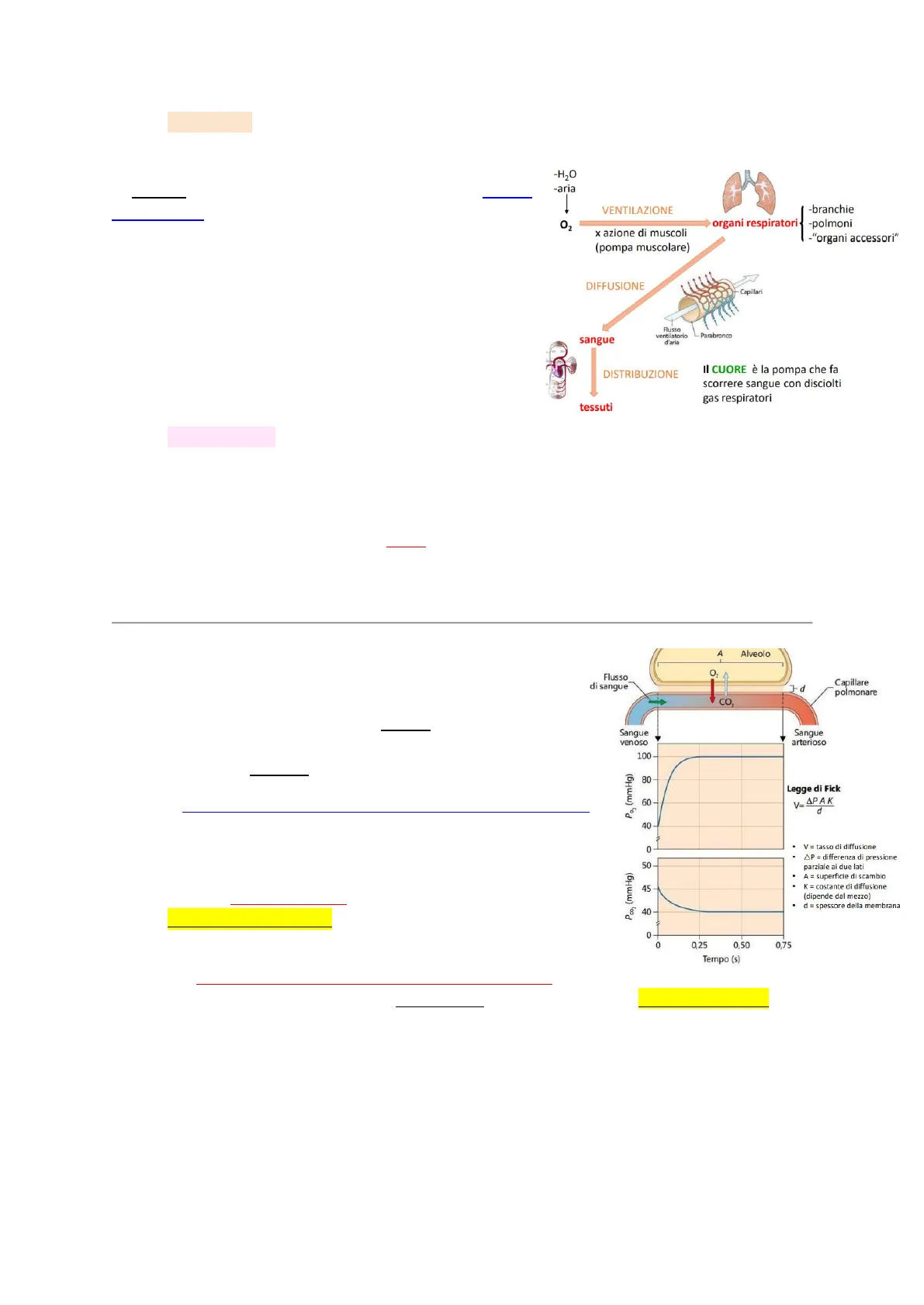 100 Po, (mmHg) 80 60 Legge di Fick V= AP AK d 40- 0 · V = tasso di diffusione 50 · AP = differenza di pressione parziale ai due lati Pco, (mmHg) 45 . K = costante di diffusione (dipende dal mezzo) · d = spessore della membrana 40 0 to 0 0,25 0,50 0,75 Il sangue povero di ossigeno quando passa a contatto con la superficie Tempo (s) respiratoria si ossigena secondo un meccanismo di DIFFUSIONE: i gas passano attraverso l'epitelio dei capillari molto sottile cioè per differenza di CONCENTRAZIONE -> da una parte c'è più ossigeno (epitelio polmonare) e dall'altra meno ossigeno (epitelio capillare). La diffusione di gas attraverso superfici respiratorie è governata dalla legge di Fick secondo cui il tasso di diffusione V, cioè quanto è efficiente la respirazione (quanto più è alta tanto più l'ossigeno passa per esempio dai polmoni al sangue in modo molto rapido e efficiente), è direttamente proporzionale: