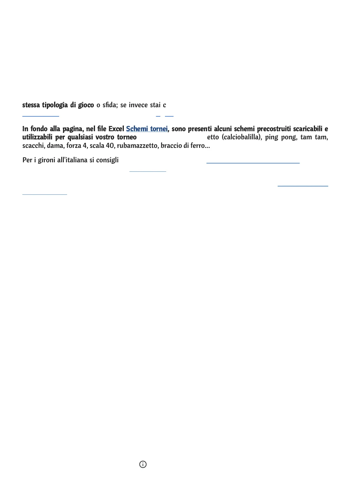 In fondo alla pagina, nel file Excel Schemi tornei, sono presenti alcuni schemi precostruiti scaricabili e utilizzabili per qualsiasi vostro torneo, che sia di calcio, calcetto (calciobalilla), ping pong, tam tam, scacchi, dama, forza 4, scala 40, rubamazzetto, braccio di ferro ... Per i gironi all'italiana si consiglia di vedere anche il file Excel Gioco a sfide - Risultati dei test e i codici Python presenti in fondo alla pagina Gioco a sfide, in particolare la tipologia Girone all'italiana classico. Se si vuole contribuire ad arricchire questa libreria con nuove tipologie o tabelloni, TI INVITIAMO A CONTATTARCI.mario