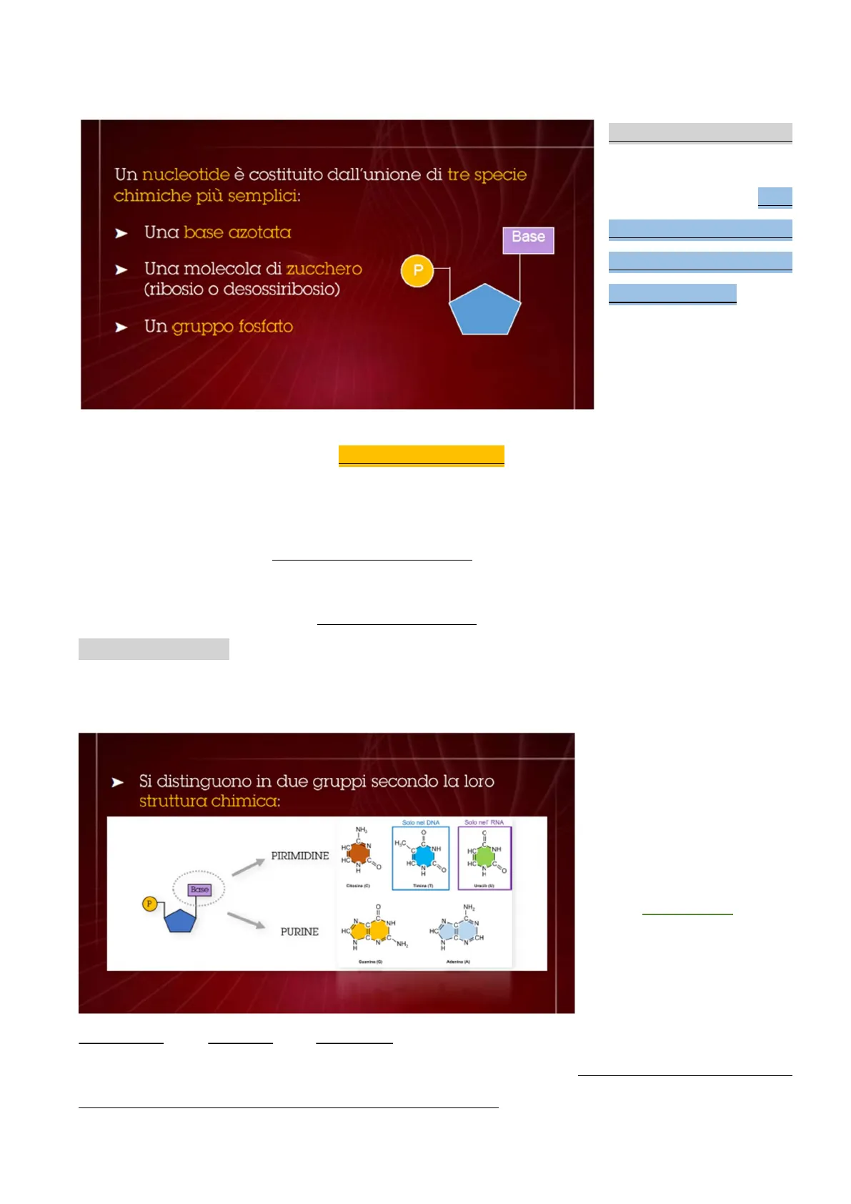 Per quanto riguarda le purine invece sono costituite da due anelli, uno a sei atomi di C e l'altro a cinque, e si distinguono in GUANINA e ADENINA. Sia la guanina che l'adenina le troviamo in tutti e due gli acidi nucleici quindi, sia nell'RNA che nel DNA.