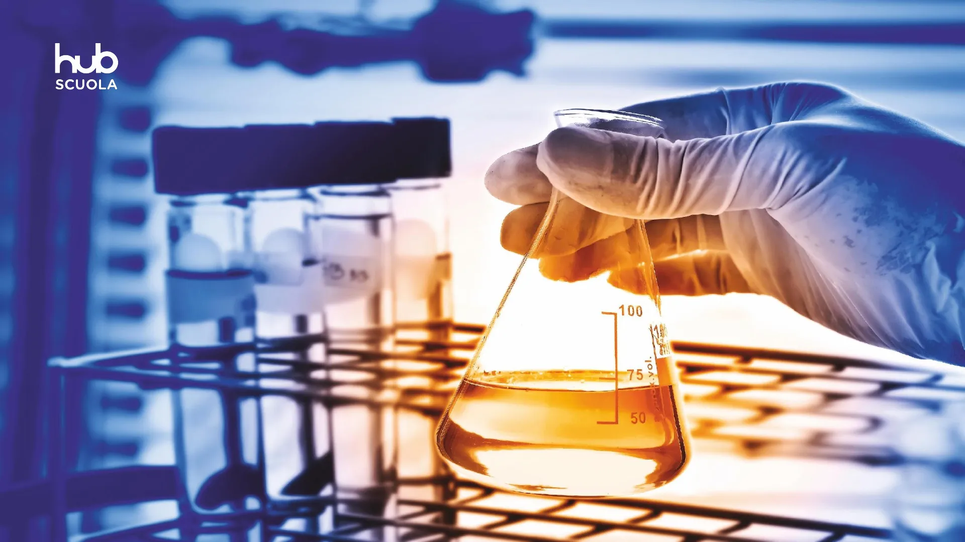 Slide da Hub Scuola su Le Basi della Chimica. Il Pdf, adatto per la scuola superiore, esplora la materia e la composizione dell'atomo, le cariche elettriche, il numero atomico e di massa, e gli isotopi, con esempi specifici sul carbonio.