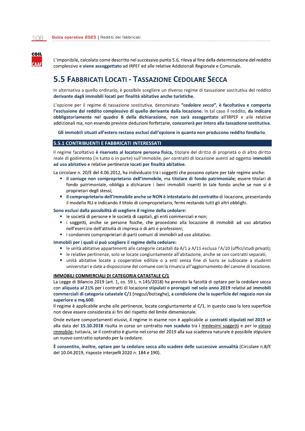 108 Guida operativa 2023 | Redditi dei fabbricati CGIL CAAF L'imponibile, calcolato come descritto nel successivo punto 5.6, rileva al fine della determinazione del reddito complessivo e viene assoggettato ad IRPEF ed alle relative Addizionali Regionale e Comunale.