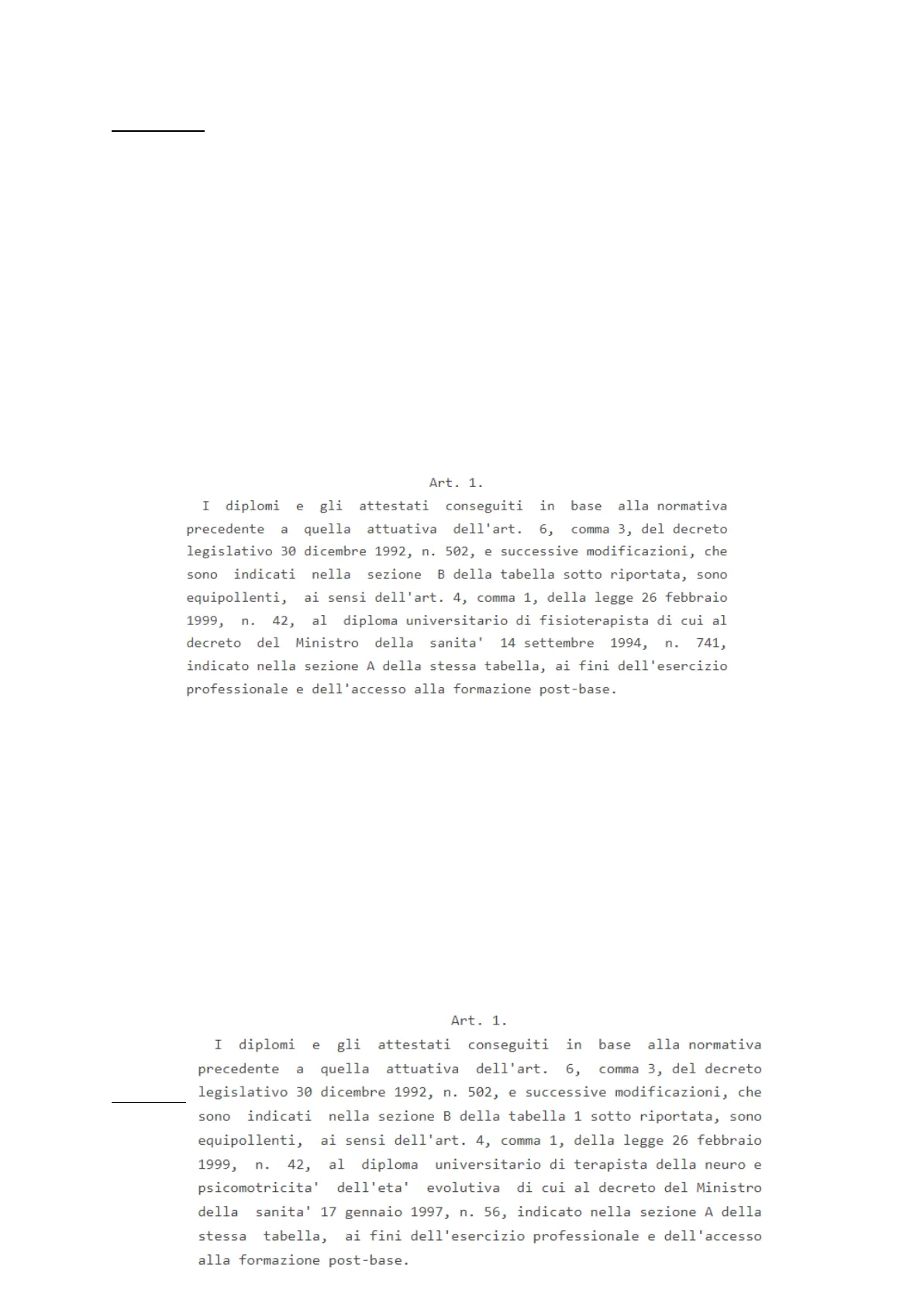 DECRETO 27 luglio 2000 Equipollenza di diplomi e di attestati al diploma universitario di fisioterapista, ai fini dell'esercizio professionale e dell'accesso alla formazione post-base. (GU Serie Generale n.190 del 16-08-2000) Art. 1. I diplomi e gli attestati conseguiti in base alla normativa precedente a quella attuativa dell'art. 6, comma 3, del decreto legislativo 30 dicembre 1992, n. 502, e successive modificazioni, che sono indicati nella sezione B della tabella sotto riportata, sono equipollenti, ai sensi dell'art. 4, comma 1, della legge 26 febbraio 1999, n. 42, al diploma universitario di fisioterapista di cui al decreto del Ministro della sanita' 14 settembre 1994, n. 741, indicato nella sezione A della stessa tabella, ai fini dell'esercizio professionale e dell'accesso alla formazione post-base.