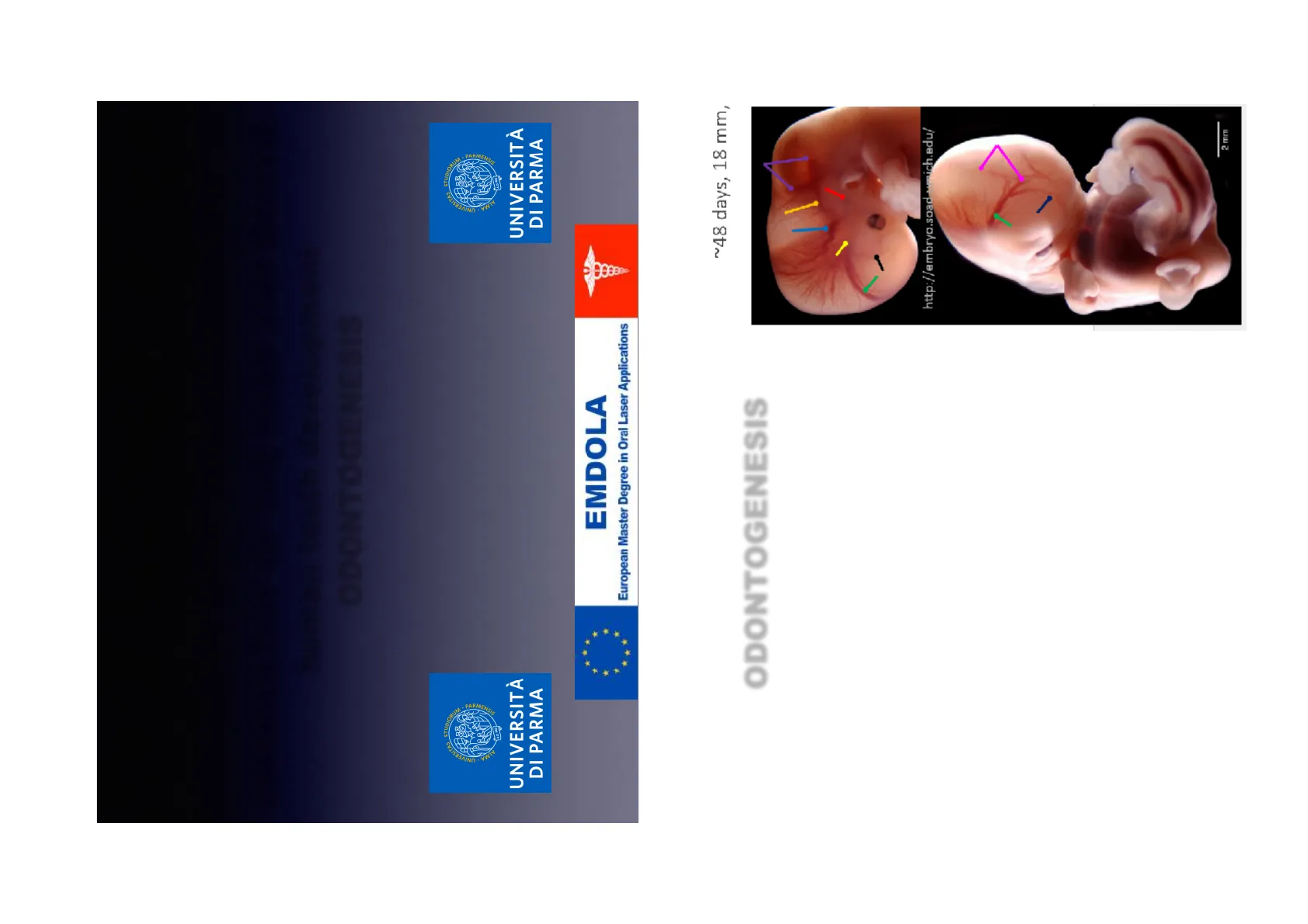 Prof. Paolo Vescovi DDS, PhD, MSc, Spec Oral Surgery MA · UNIVERSIT Dasser and · PARMENSISODONTOGENESIS Teeth develop and erupt at different times as a result of a complex, multi-step process, involving the patterning of inductive signals and homeobox genes. Signalling occurs between the oral epithelium and the underlying mesenchyme. Temporal and spatial control of gene expression leads to formation of different tooth types. Tooth development is recognised to occur in stages - initiation, morphogenesis, and differentiation.