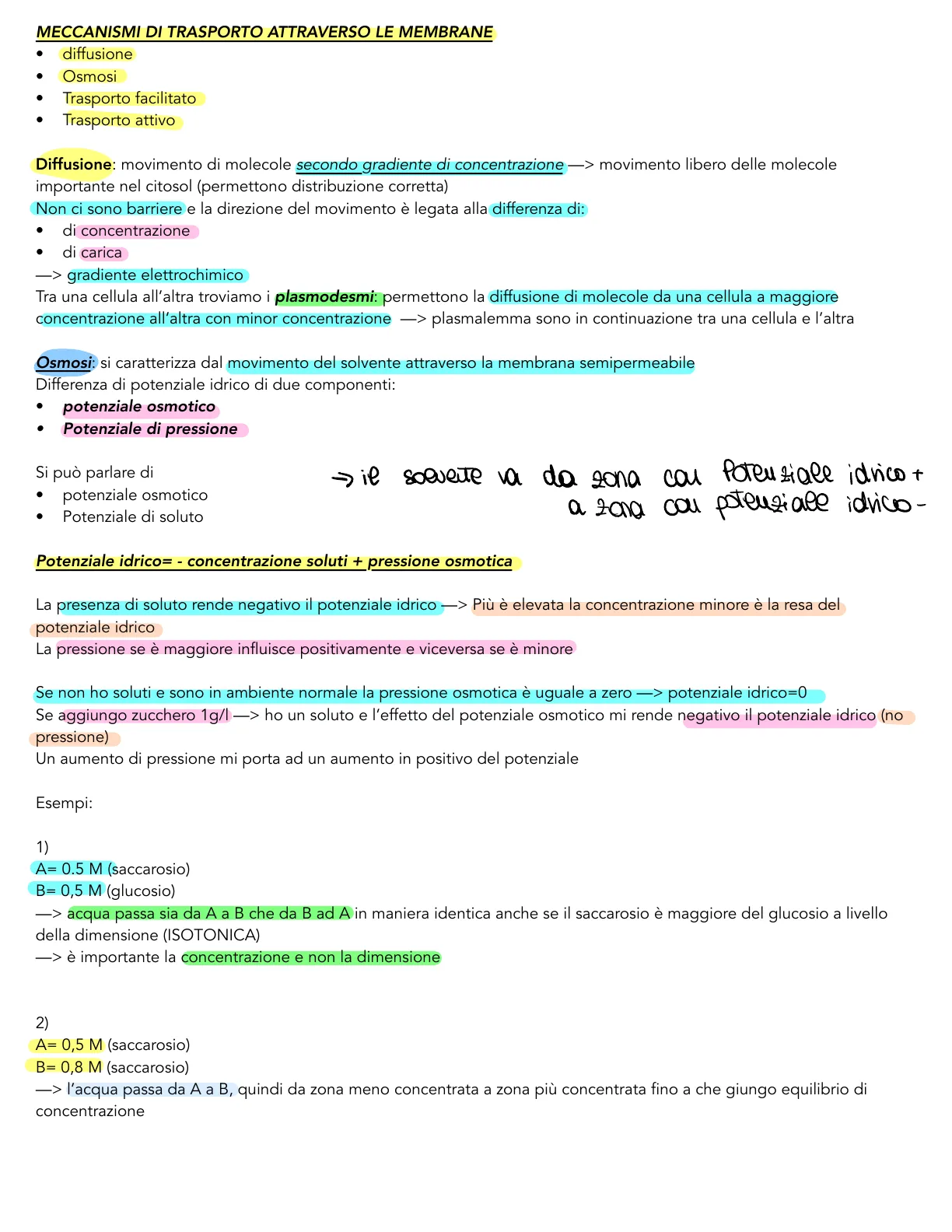 Osmosi: si caratterizza dal movimento del solvente attraverso la membrana semipermeabile Differenza di potenziale idrico di due componenti: · potenziale osmotico · Potenziale di pressione Si può parlare di -> il solvente va da zona con Potenziale idrico + · potenziale osmotico a zona con potenziale idrico - Potenziale idrico= - concentrazione soluti + pressione osmotica La presenza di soluto rende negativo il potenziale idrico -> Più è elevata la concentrazione minore è la resa del potenziale idrico La pressione se è maggiore influisce positivamente e viceversa se è minore Se non ho soluti e sono in ambiente normale la pressione osmotica è uguale a zero -> potenziale idrico=0 Se aggiungo zucchero 1g/l -> ho un soluto e l'effetto del potenziale osmotico mi rende negativo il potenziale idrico (no pressione) Un aumento di pressione mi porta ad un aumento in positivo del potenziale