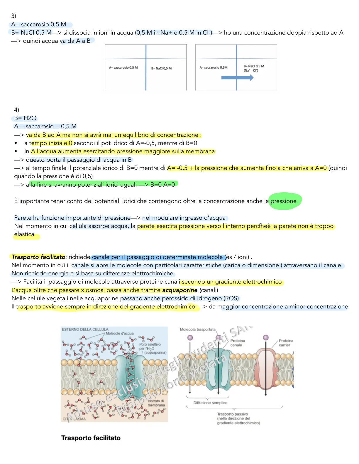 Esempi: 1) A= 0.5 M (saccarosio) B= 0,5 M (glucosio) -> acqua passa sia da A a B che da B ad A in maniera identica anche se il saccarosio è maggiore del glucosio a livello della dimensione (ISOTONICA) -> è importante la concentrazione e non la dimensione 2) A= 0,5 M (saccarosio) B= 0,8 M (saccarosio) -> l'acqua passa da A a B, quindi da zona meno concentrata a zona più concentrata fino a che giungo equilibrio di concentrazione · Potenziale di soluto3) A= saccarosio 0,5 M B= NaCI 0,5 M-> si dissocia in ioni in acqua (0,5 M in Na+ e 0,5 M in CI-)-> ho una concentrazione doppia rispetto ad A -> quindi acqua va da A a B A= saccarosio 0,5 M B= NaCI 0,5 M A= saccarosio 0,5M B= NaCI 0,5 M (Na* CI") 4) B= H2O A = saccarosio = 0,5 M -> va da B ad A ma non si avrà mai un equilibrio di concentrazione : · a tempo iniziale 0 secondi il pot idrico di A =- 0,5, mentre di B=0 · In A l'acqua aumenta esercitando pressione maggiore sulla membrana -> questo porta il passaggio di acqua in B -> al tempo finale il potenziale idrico di B=0 mentre di A= - 0,5 + la pressione che aumenta fino a che arriva a A=0 (quindi quando la pressione è di 0,5) -> alla fine si avranno potenziali idrici uguali -> B=0 A=0 È importante tener conto dei potenziali idrici che contengono oltre la concentrazione anche la pressione Parete ha funzione importante di pressione-> nel modulare ingresso d'acqua Nel momento in cui cellula assorbe acqua, la parete esercita pressione verso l'interno percfheè la parete non è troppo elastica