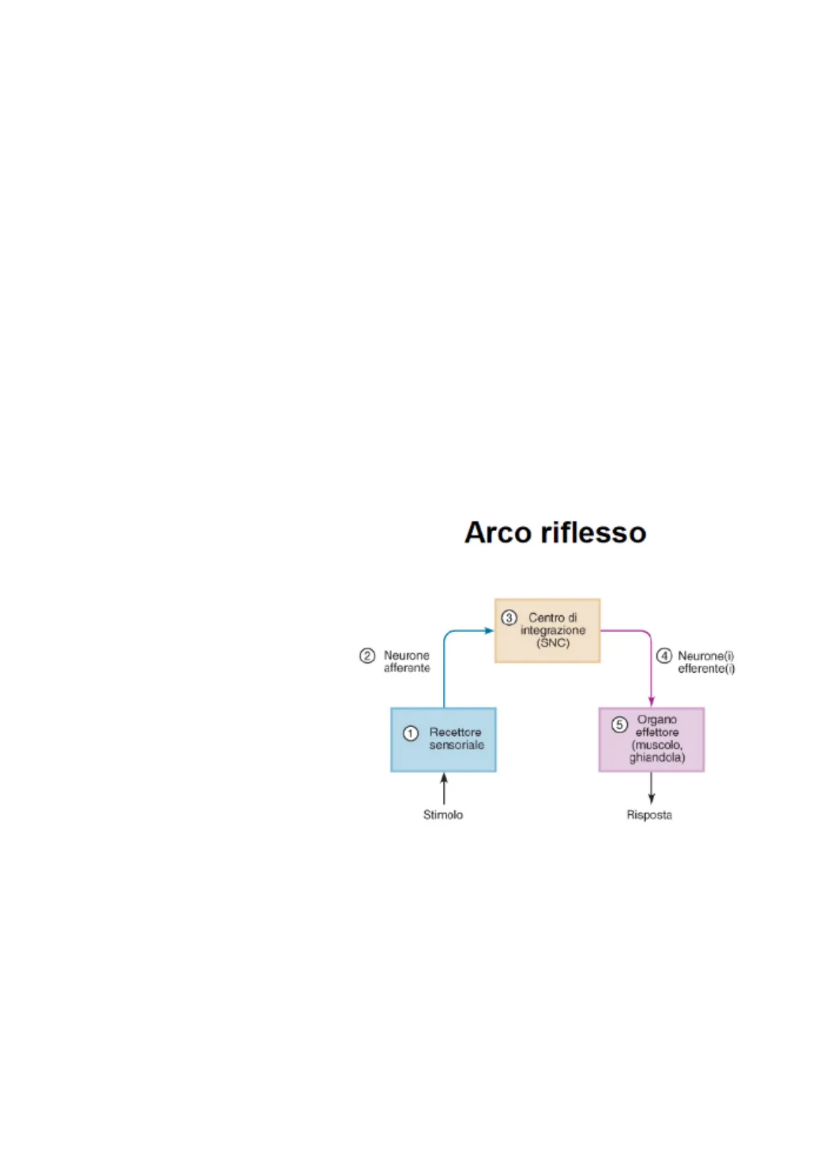 Riprendiamo alcuni dei concetti che abbiamo trattato la scorsa lezione. Abbiamo identificato un riflesso nervoso come una risposta involontaria ad uno stimolo, ciò vuol dire che non sottende quei circuiti nervosi principalmente a livello corticale, in generale a livello encefalico, che ci servono per andare a generare una risposta volontaria. Viceversa, la risposta involontaria è una risposta che viene generata a livello di circuiti che non necessitano di un controllo specifico dalla generazione della risposta, bensì solo nella modulazione della risposta. Abbiamo detto inoltre che le risposte riflesse nascono se abbiamo uno stimolo in ingresso, senza stimoli in ingresso noi non abbiamo alcuna risposta riflessa. Le risposte riflesse sono stereotipate, ovvero hanno una forma che si riproduce sempre uguale nel tempo, quello che cambia in esse è l'ampiezza, ovvero a parità di stimoli in ingresso noi potremmo avere una risposta riflessa che ha una determinata forma, ma la sua ampiezza può essere modulata, vedremo una serie di esempi in questa lezione. Abbiamo anche detto che quando parliamo di risposte riflesse, le possiamo descrivere attraverso un insieme di elementi circuitali che descrivono quello che viene chiamato arco riflesso.