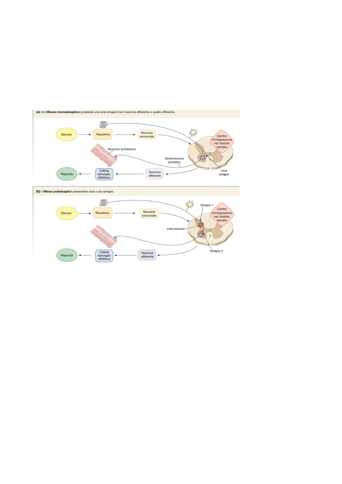 Da una parte abbiamo un'azione che dalla periferia parte e va sul motoneurone che si attiva; nel secondo esempio se abbiamo un'attività che proviene dalla periferia, andando ad eccitare un interneurone inibitorio, esso va ad inibire il motoneurone somatico. Questi due esempi ci serviranno poi per trattare il primo riflesso, che è quello che viene chiamato riflesso miotattico.