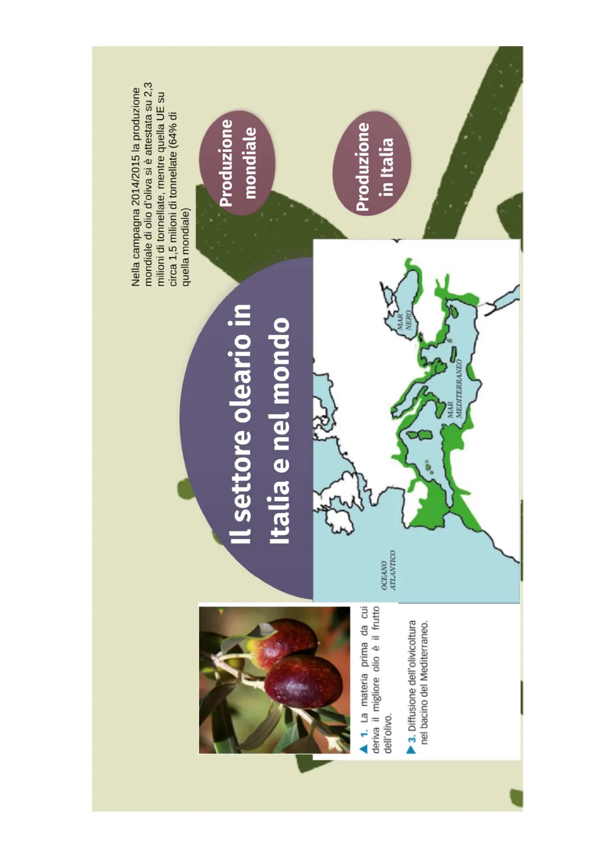Slide sull'Olio di Oliva, il settore oleario in Italia e nel mondo. Il Pdf esplora la produzione mondiale e italiana, le variazioni sulla pianta e le principali cultivar. Il documento, utile per la scuola superiore in Scienze, illustra il ciclo vegetativo dell'olivo e le sue fasi fenologiche.