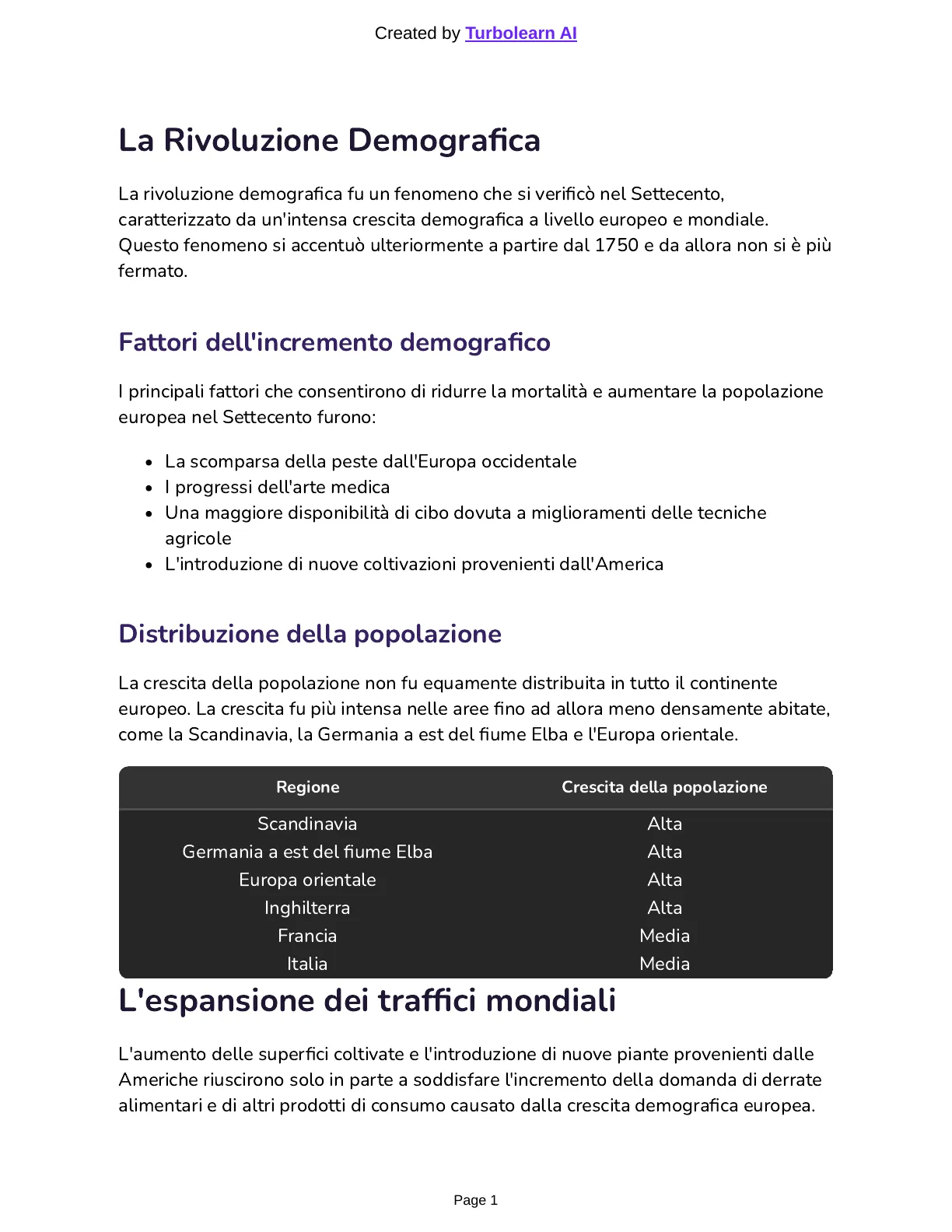 Documento di Turbolearn Ai sulla Rivoluzione Demografica. Il Pdf, utile per l'università e la materia di Storia, esplora i fattori di crescita demografica, l'economia-mondo, il commercio intercontinentale e atlantico degli schiavi, lo sviluppo finanziario e la Riforma di Turgot.