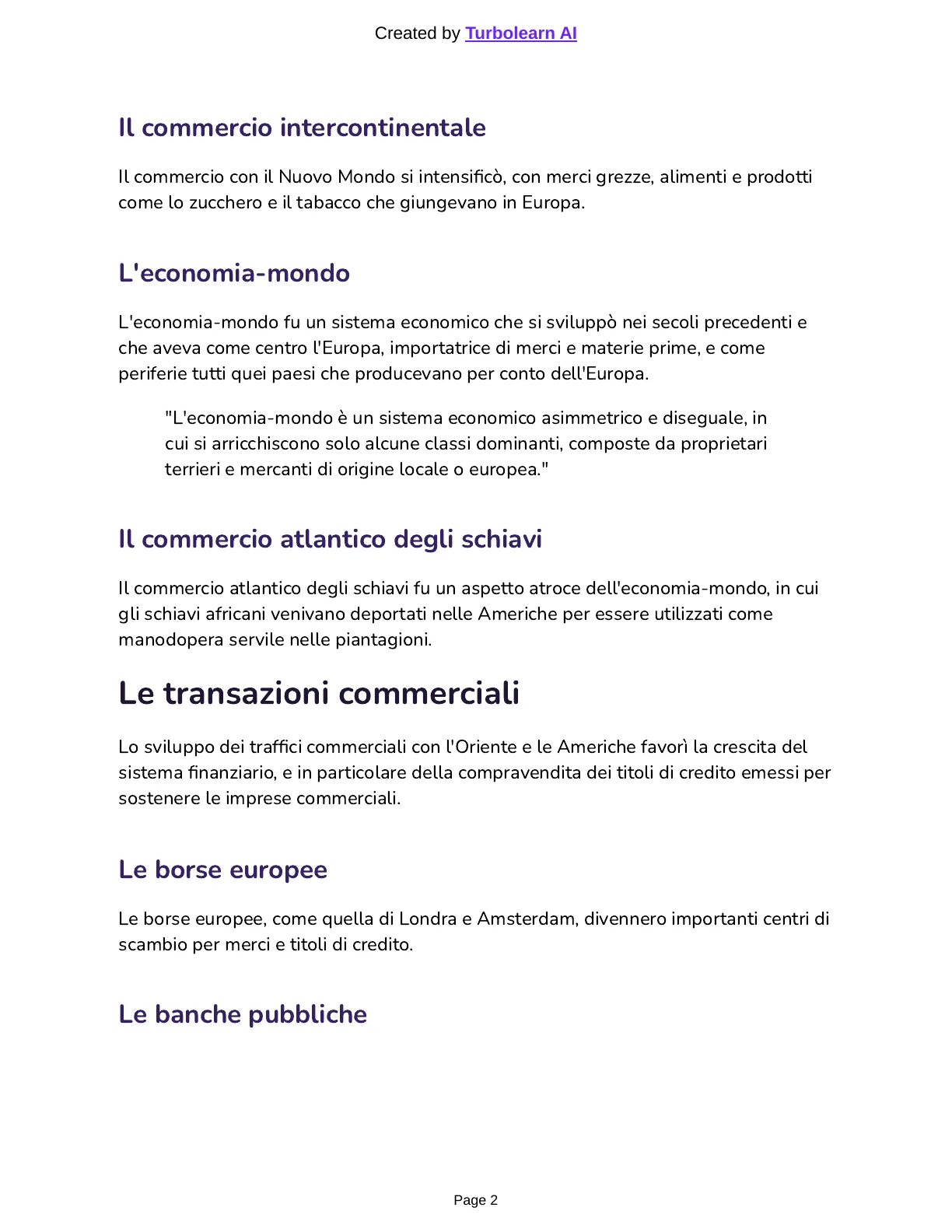 Page 2Created by Turbolearn AI L'istituzione delle banche pubbliche, come la Banca d'Inghilterra, permise agli stati di raccogliere capitali attraverso i depositi dei cittadini o l'emissione di titoli di Stato senza fare ricorso a finanziatori privati.